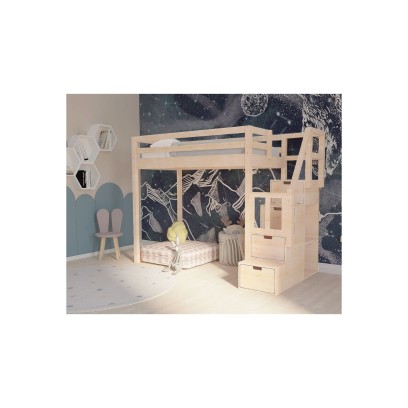 Antresola łóżko ze schodkami do pokoi dziecięcych i młodzieżowych. Minimalistyczny design mebla i wizualnie lekka konstrukcja świetnie sprawdzą się w mniejszych pokojach, zapewniając równocześnie maksymalne zagospodarowanie miejsca. Przestrzeń pod łóżkiem nadaje się do ustawienia niskich mebelków, skrzyń lub pojemników na rzeczy dziecka czy też stworzenia strefy relaksu. W schodkach ukryto pojemne szufladki na drobiazgi, których nie brakuje w dziecięcych i młodzieżowych pokojach.