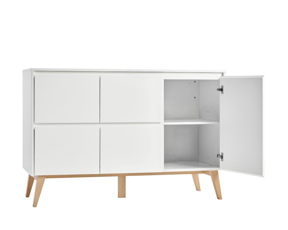 Materiał: fronty i korpus – płyta MDF lakierowana farbą wodną; wnętrze – płyta wiórowa laminowana; nogi – lite drewno bukowe