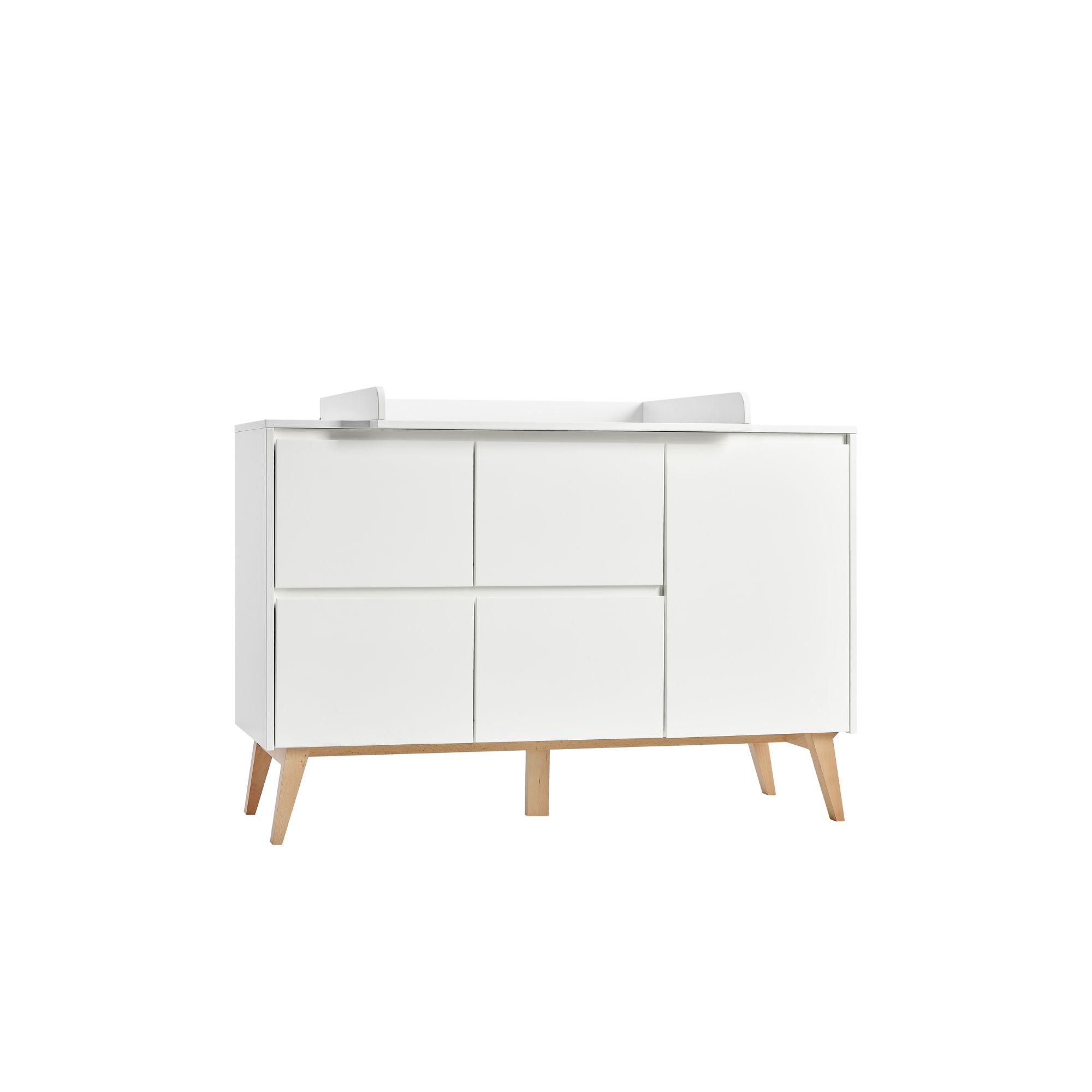 Połączenie bieli i naturalnego buku to klasyka stylu skandynawskiego – komoda z przewijakiem Swing biała wprowadza do pokoju dziecka spokój, świeżość i przytulny klimat, który łatwo uzupełnisz tekstyliami i dodatkami w ulubionej kolorystyce.