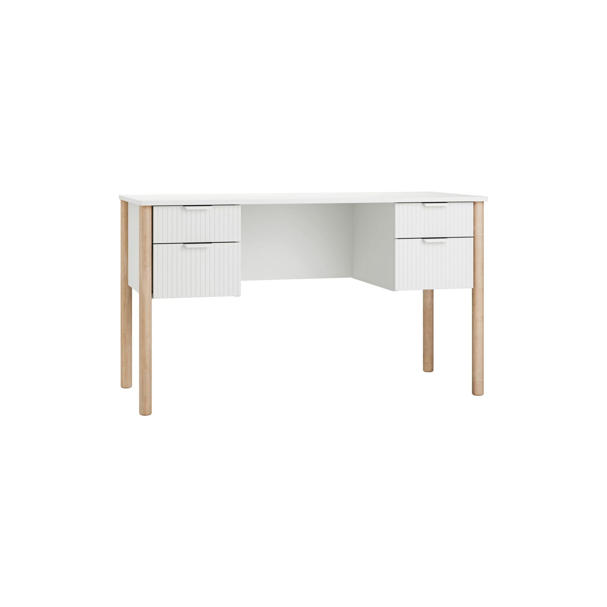 Biurko Miloo białe to wygodny mebel do pokoju dziecka i nastolatka – z szerokim blatem i 4 pojemnymi szufladami. Jasna kolorystyka, ryflowane fronty i bukowe nogi nawiązują do pozostałych mebli z kolekcji Miloo, dzięki czemu łatwo stworzysz spójną strefę nauki z regałem, komodą czy szafą w tym samym stylu.