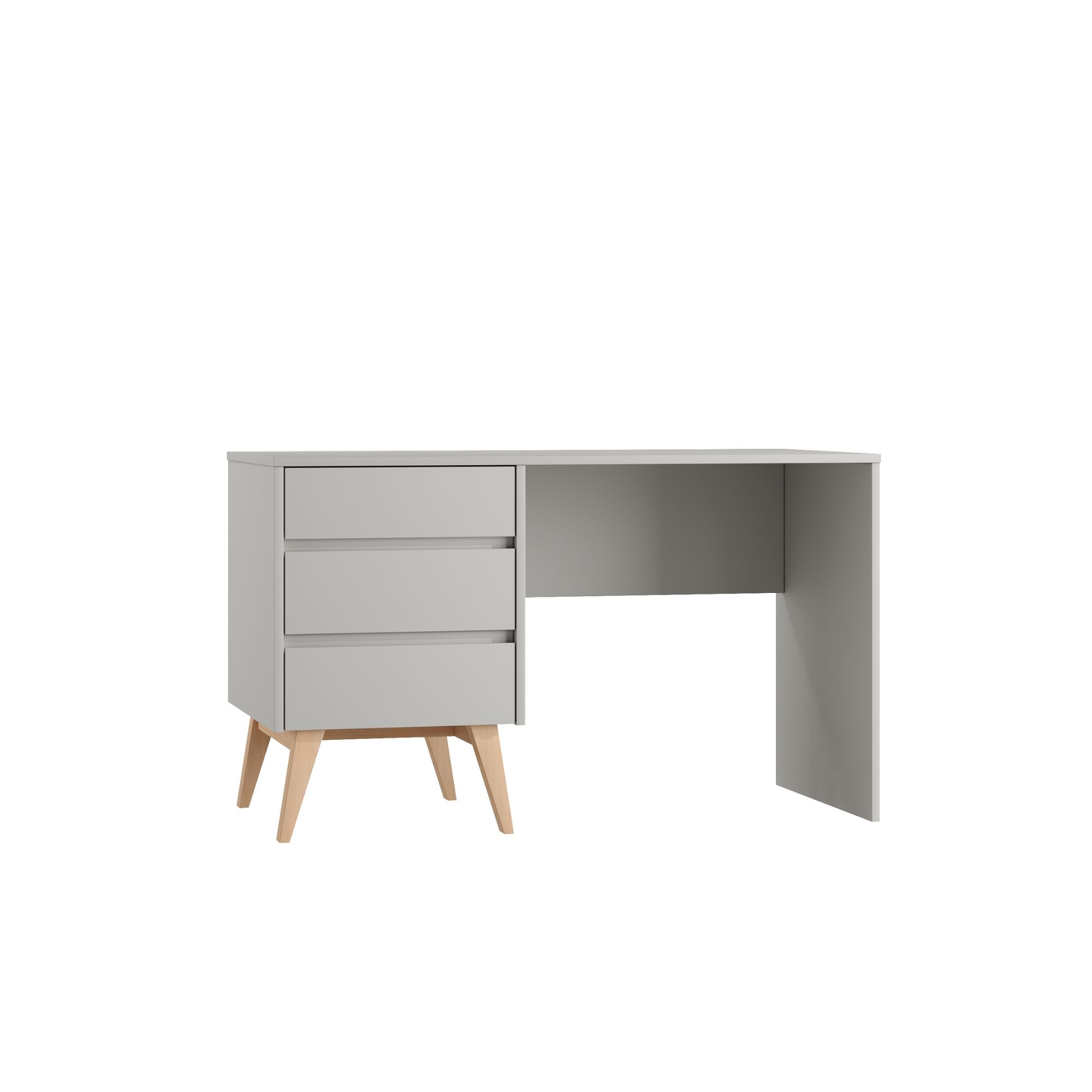 Z perspektywy psychologii i neuroestetyki szarość kojarzy się z stabilnością i równowagą. W połączeniu z naturalnym bukowym drewnem nogi dodają wnętrzu przytulności, a jednocześnie zachowują nowoczesny charakter. Szare biurko łatwo połączysz z ulubionymi kolorami dziecka – od pudrowych pasteli po mocne, kontrastowe akcenty.