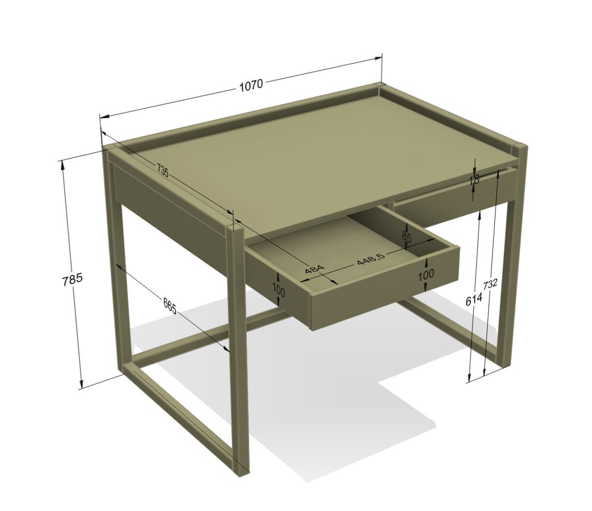 Funkcjonalność: 2 szuflady o wymiarach ok. 45 × 48 × 8 cm oraz przestronny blat z podniesionymi krawędziami
