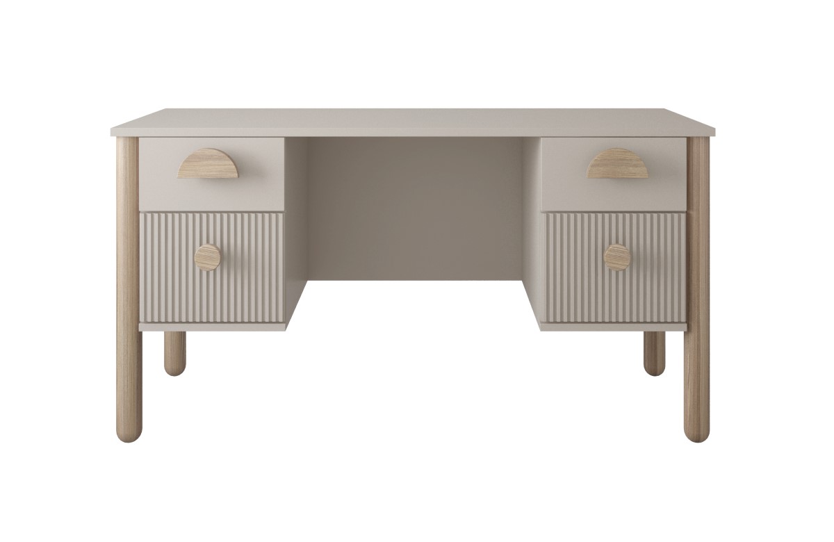 Biurko dla dziecka Cocolo kaszmir 140 cm to solidne, wygodne miejsce do nauki, rysowania i pracy przy komputerze. Szeroki blat, cztery szuflady o różnych głębokościach oraz ciepły odcień kaszmiru sprawiają, że biurko pasuje zarówno do pokoju dziewczynki, jak i chłopczyka. Naturalne bukowe nogi i uchwyty oraz ryflowane fronty dolnych szuflad nawiązują do pozostałych mebli z kolekcji Cocolo, dzięki czemu łatwo stworzysz spójną strefę nauki z dopasowaną komodą, szafą czy regałem.