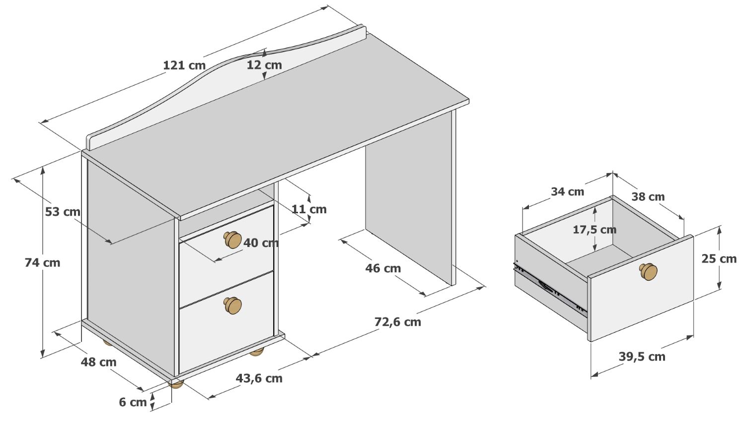 Blat ma wygodną szerokość, która pomieści zeszyty, organizer na przybory, lampkę oraz monitor lub laptop w pokoju starszego dziecka. Delikatnie wygięta „falbana” przy blacie jest subtelną ozdobą, a jednocześnie chroni ścianę przed zabrudzeniami.