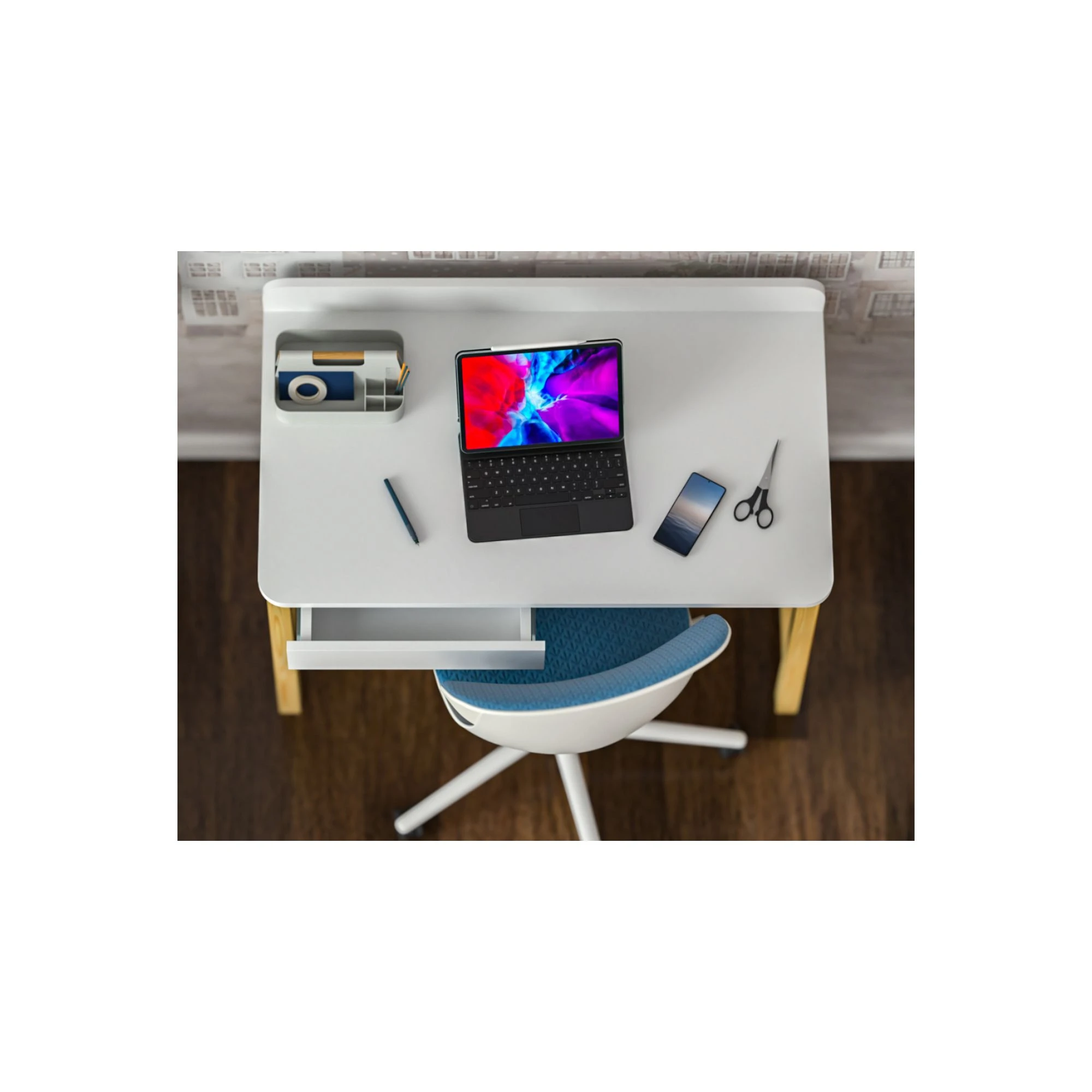 Biurko Trendy ma prostą, lekką wizualnie formę, dlatego łatwo dopasować je do różnych aranżacji. Sprawdzi się zarówno w spokojnych, naturalnych wnętrzach, jak i w bardziej nowoczesnym pokoju dziecięcym.