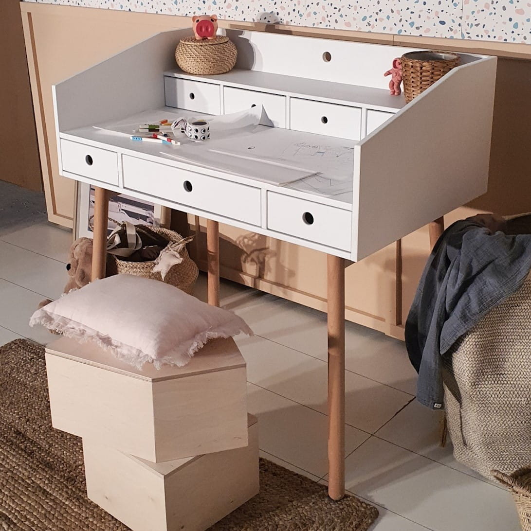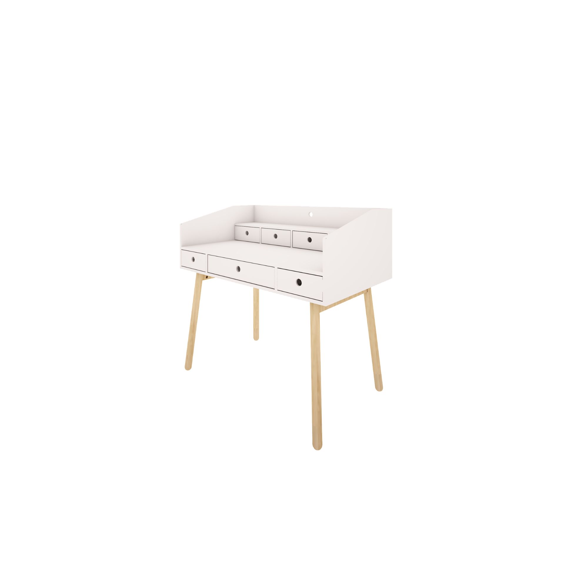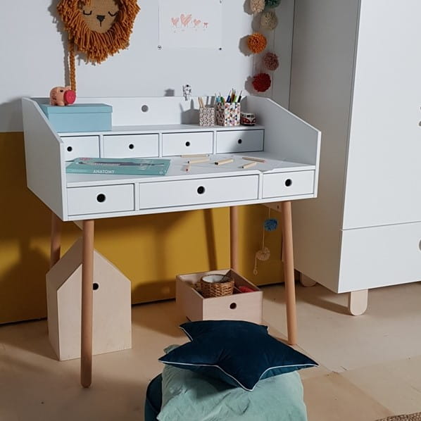 Biurko sekretarzyk wykonane jest z białej płyty mdf oraz drewna bukowego - nogi. Całość malowana certyfikowanym lakierem wodnym, bezpiecznym dla dziecka (zgodność z normą EN71/3 - norma dotycząca mebli dziecięcych oraz zabawek).
