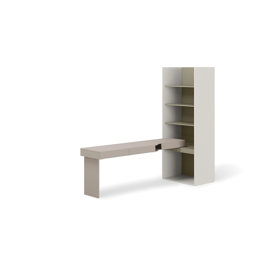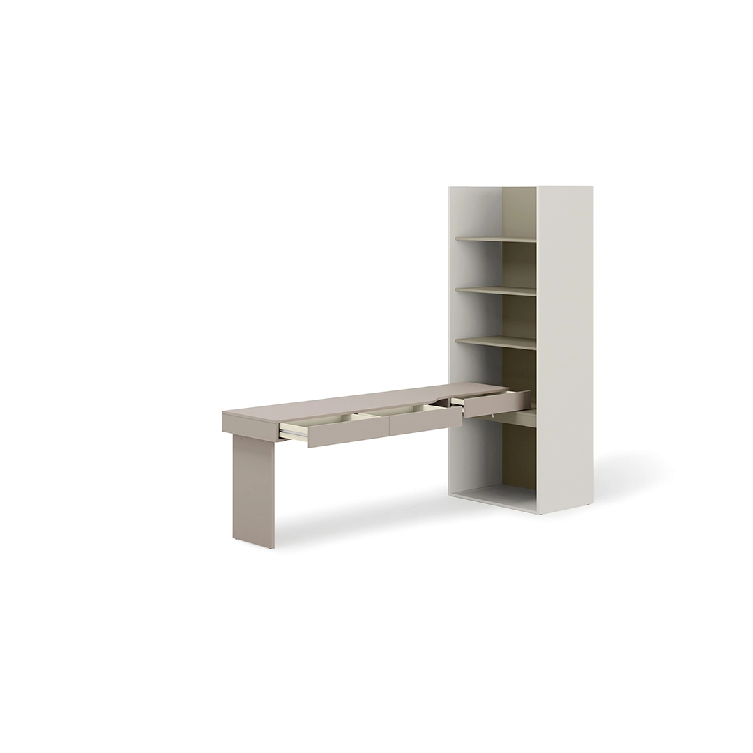 Regał i biurko tworzą zestaw o szerokości 253 cm – idealny do pokoi, w których liczy się dobra organizacja i estetyka.
