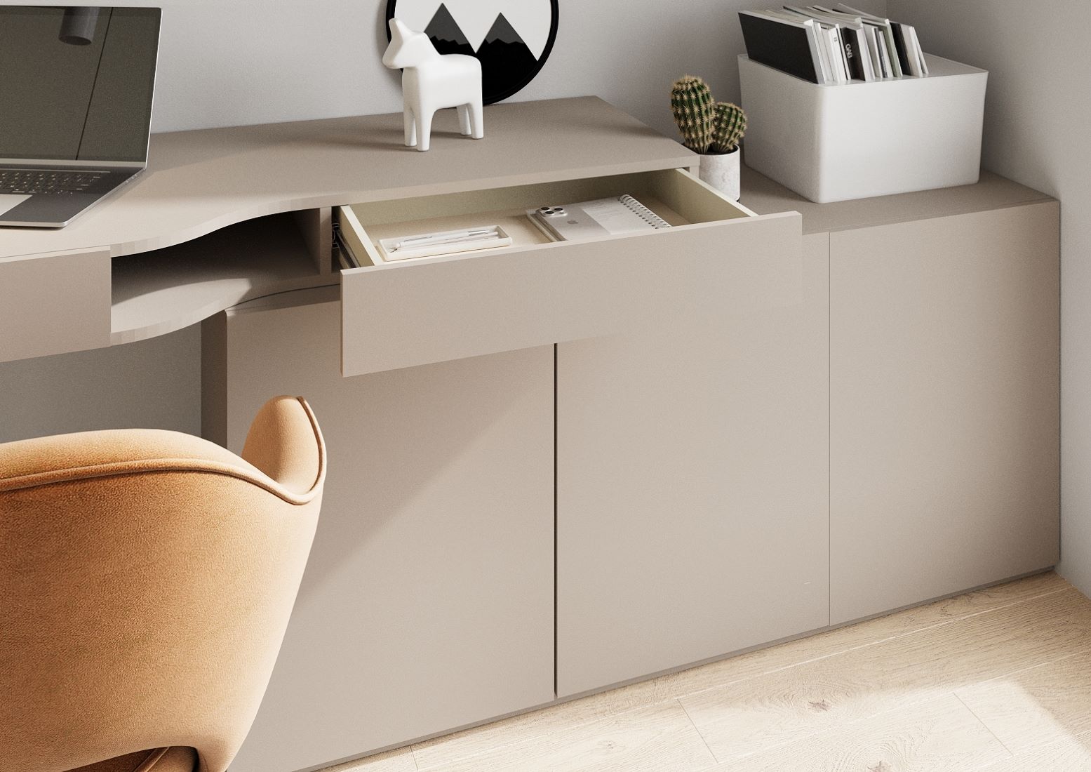 Minimalistyczna forma i neutralna kolorystyka sprawiają, że biurko pasuje zarówno do jasnych, skandynawskich wnętrz, jak i do bardziej surowych, industrialnych przestrzeni.