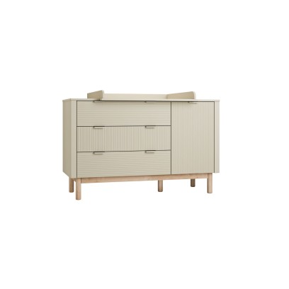 Szampańska duża komoda z przewijakiem Miloo to mebel, który łączy wygodne miejsce do przewijania z bardzo pojemnym przechowywaniem ubranek i tekstyliów. Trzy szerokie szuflady, zamykana szafka z półką oraz nakładka do przewijania na blacie pomagają uporządkować codzienną pielęgnację maluszka. Delikatny szampański kolor, ryflowane fronty i bukowe nóżki nawiązują do całej kolekcji mebli dziecięcych Miloo, dzięki czemu łatwo zbudujesz spójny zestaw z łóżeczkiem, szafą czy regałem.