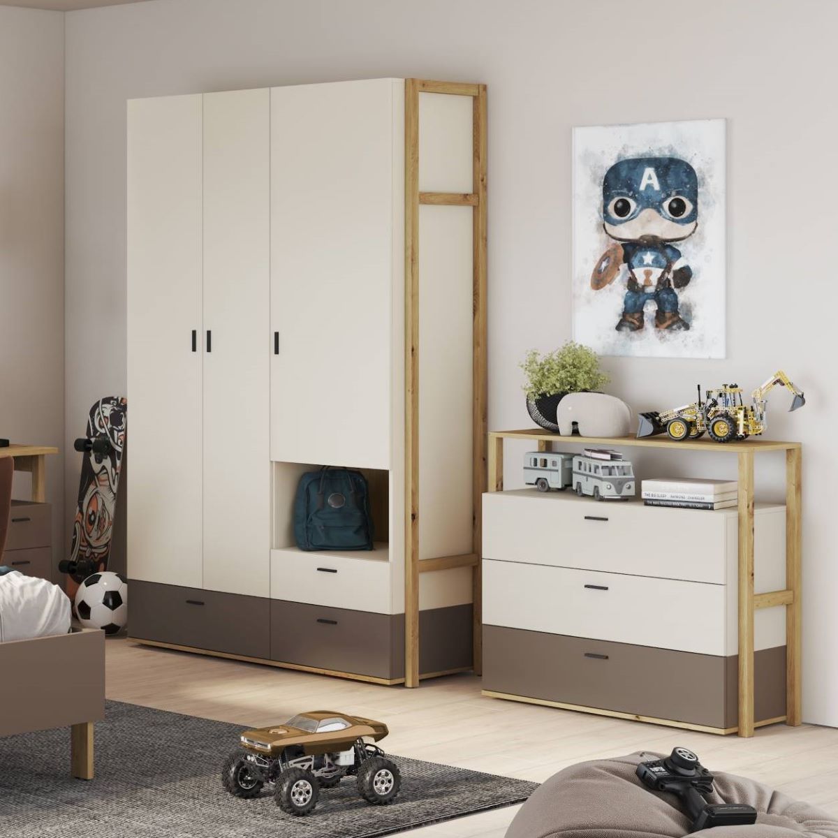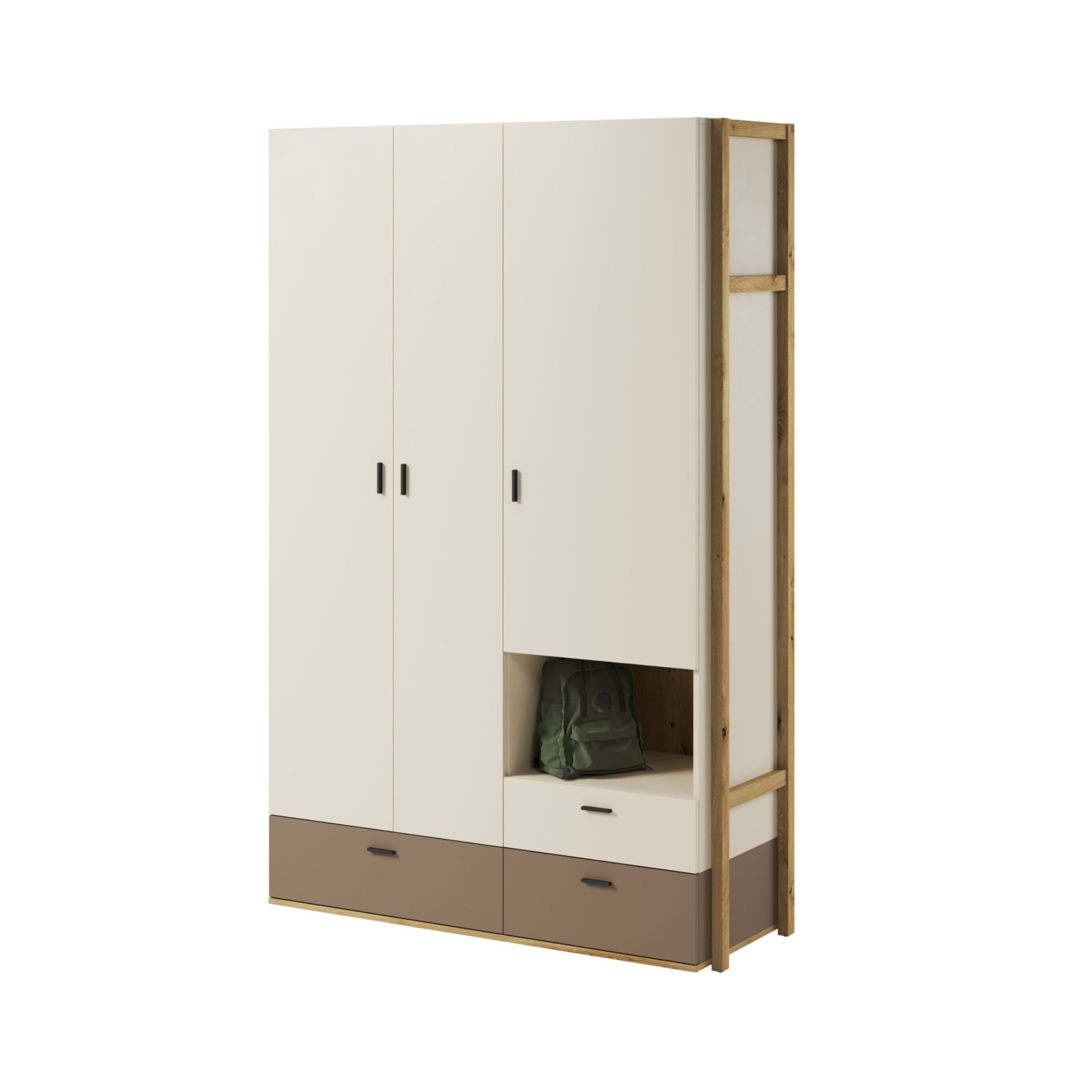 Duża szafa młodzieżowa Lenny to pojemna, trzydrzwiowa szafa o wysokości 210 cm, szerokości 135 cm i głębokości 51 cm. Jasny beż piaskowy łączy się tu z ciemniejszym, truflowym wykończeniem szuflad oraz wstawkami dąb artisan, tworząc spokojne tło do nauki i odpoczynku. Szafa świetnie komponuje się z innymi meblami z kolekcji Lenny, dzięki czemu można łatwo urządzić spójny pokój młodzieżowy – od strefy garderoby, po kącik do nauki i relaksu.