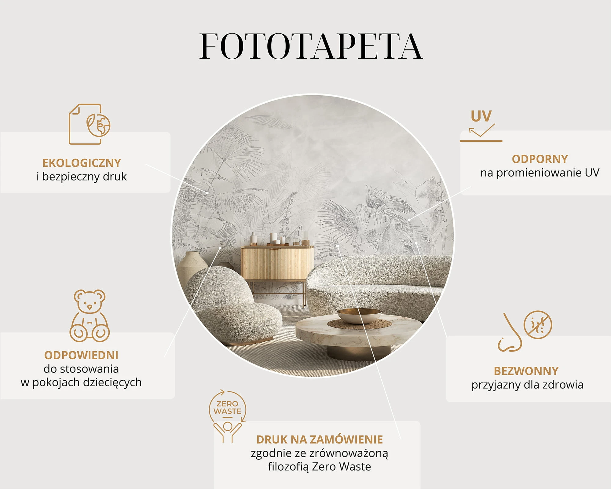 Materiał vinylowy na podkładzie flizelinowej z ze strukturą „piasku” to materiał znany z tapet tradycyjnych. Drukowany w ekologicznej technologii druku lateksowego HP najwyższej jakości, dzięki czemu kolory zachowują swoją intensywność i długotrwałość. Materiał jest półmatowy, miękki i bardzo przyjemny w dotyku, ma wyczuwalną strukturę piasku na powierzchni. Szerokie zastosowanie materiału powoduje, że materiał będzie się sprawdzał nie tylko w pomieszczeniach mieszkalnych, ale również w pomieszczeniach biurowych, szkołach, hotelach, restauracjach itp.