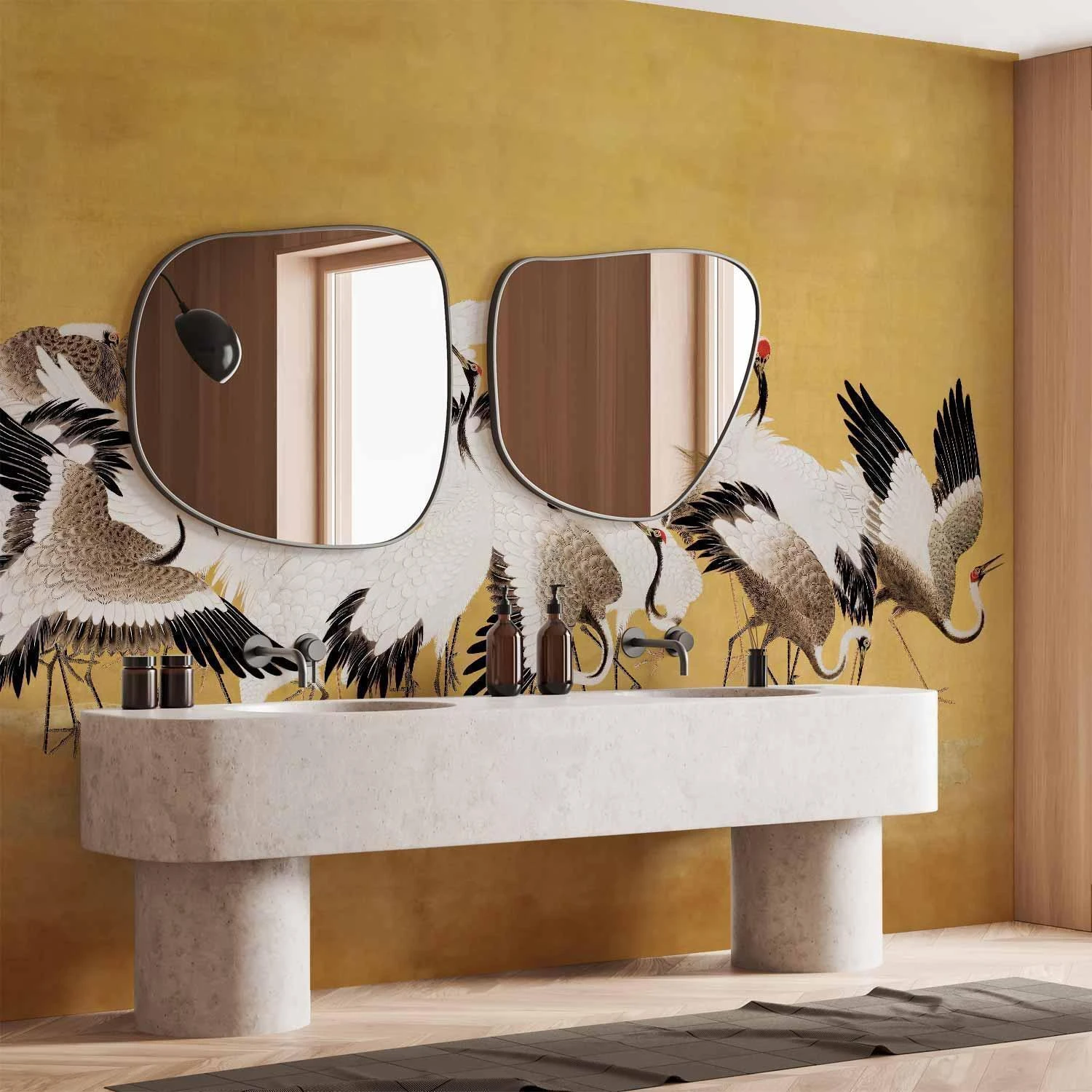 Fototapety stają się coraz bardziej popularne i z pewnością jeszcze długo będą wpisywać się w obowiązujące trendy wnętrzarskie. Wynika to m.in. z faktu, że dają spektakularne efekty, a ich montaż nie stanowi dużego problemu. Fototapeta "Fototapeta - Japońskie żurawie - stado ptaków na tle w odcieniu złota na podstawie obrazu Ishida Yūtei" pozwala na całkowitą zmianę dotychczasowej aranżacji i to bez potrzeby przeprowadzania gruntownego remontu. Wystarczy odpowiednio dobrać wzór, aby stworzyć klimatyczne i eleganckie wnętrze. Nasze fototapety na wymiar to odpowiedni wybór dla każdego, komu marzy się metamorfoza domu. Z ich pomocą można bez dużego wysiłku odświeżyć dowolne pomieszczenie, a więc sypialnię, salon, pokój dziecka czy jadalnię. Fototapety ścienne są niezwykle łatwe w montażu. W porównaniu do zwykłego malowania praca nie zajmuje tak dużo czasu, można z powodzeniem wykonać ją samodzielnie. W dodatku taka dekoracja pozwala na zamaskowanie niedoskonałości ścian (np. trudnych do usunięcia plam) i uzyskanie doskonałych efektów.