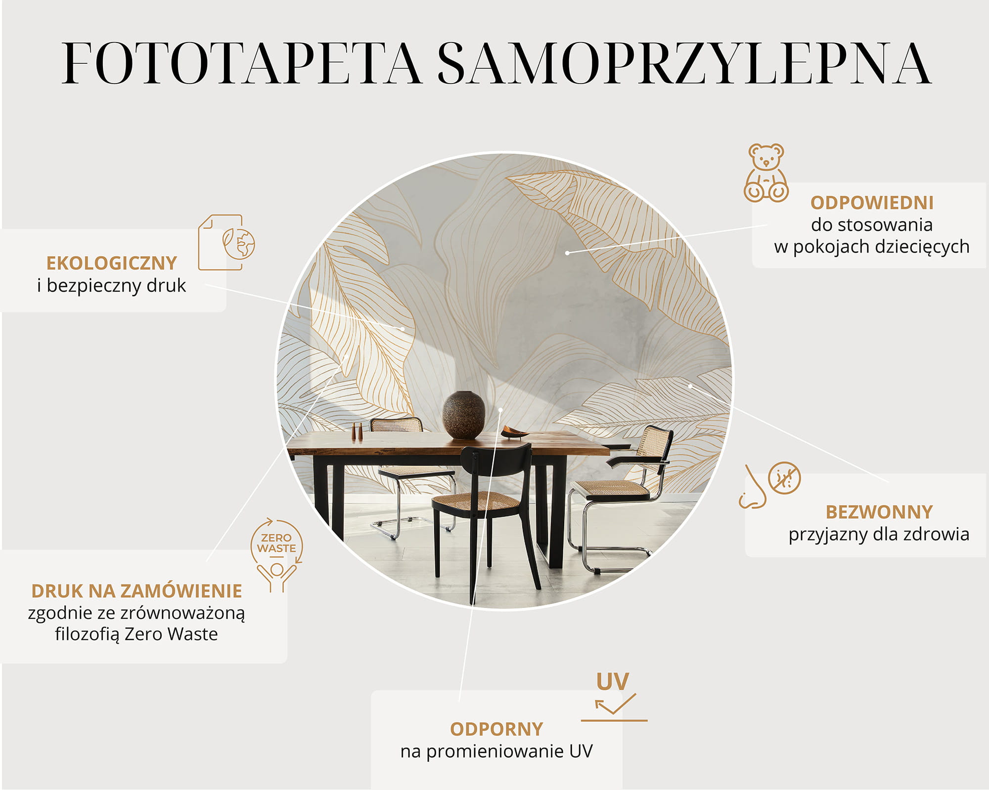 Tapety samoprzylepne są bardzo łatwe i szybkie w aplikacji. Oferowany materiał samoprzylepny posiada klej kropelkowy, repozycjonowalny, dzięki czemu jest łatwy w naklejaniu. Tapeta nie uszkodzi się jeśli skleją się końcówki materiału, albo gdy trzeba odkleić kawałek i przykleić ponownie. Drukowane w ekologicznej technologii druku lateksowego HP najwyższej jakości, dzięki czemu kolory zachowują swoją intensywność i długotrwałość. Szerokie zastosowanie materiału sprawia, że świetnie prezentuje się nie tylko na ścianie, ale także na innych gładkich powierzchniach tj. meblach, lustrze, powierzchniach szklanych lub z tworzywa sztucznego.