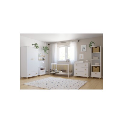 Jasny pokój dziecięcy Lilo to gotowa aranżacja, która pomaga stworzyć funkcjonalny, uporządkowany pokój dziecięcy od pierwszych dni życia. Dominują tu białe meble z kolekcji Lilo z drewnianymi detalami – optycznie powiększają wnętrze, odbijają światło dzienne i stanowią neutralne tło dla tekstyliów, zabawek i dekoracji. Dzięki temu możesz łatwo zmieniać charakter pokoju, nie wymieniając całego wyposażenia.