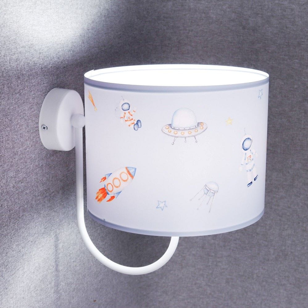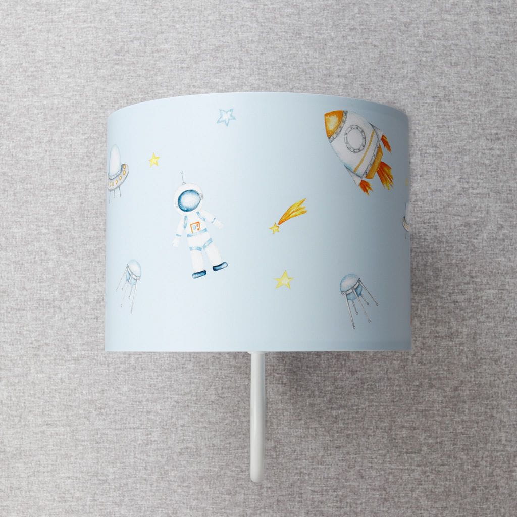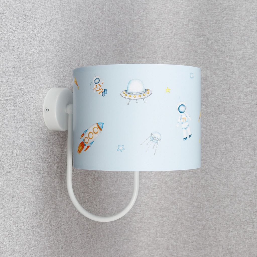 Dla wszystkich małych miłośników pojazdów kosmicznych przedstawiamy kinkiet do pokoju chłopca. Abażur kinkietu pokryty jest nadrukiem lateksowym przedstawiającym rakiety i inne niezidentyfikowane pojazdy latające, o pilotowaniu których można pomarzyć przed zaśnięciem. Światło kinkietu jest dodatkowym oświetleniem pokoju dziecięcego a jego delikatne światło wprowadzi przytulny nastrój. Oprócz kinkietu, w kolekcji znajdują się: lampa wiszą, lampka nocna i lampa stojąca. A wszystkie z kosmicznymi abażurami:)
