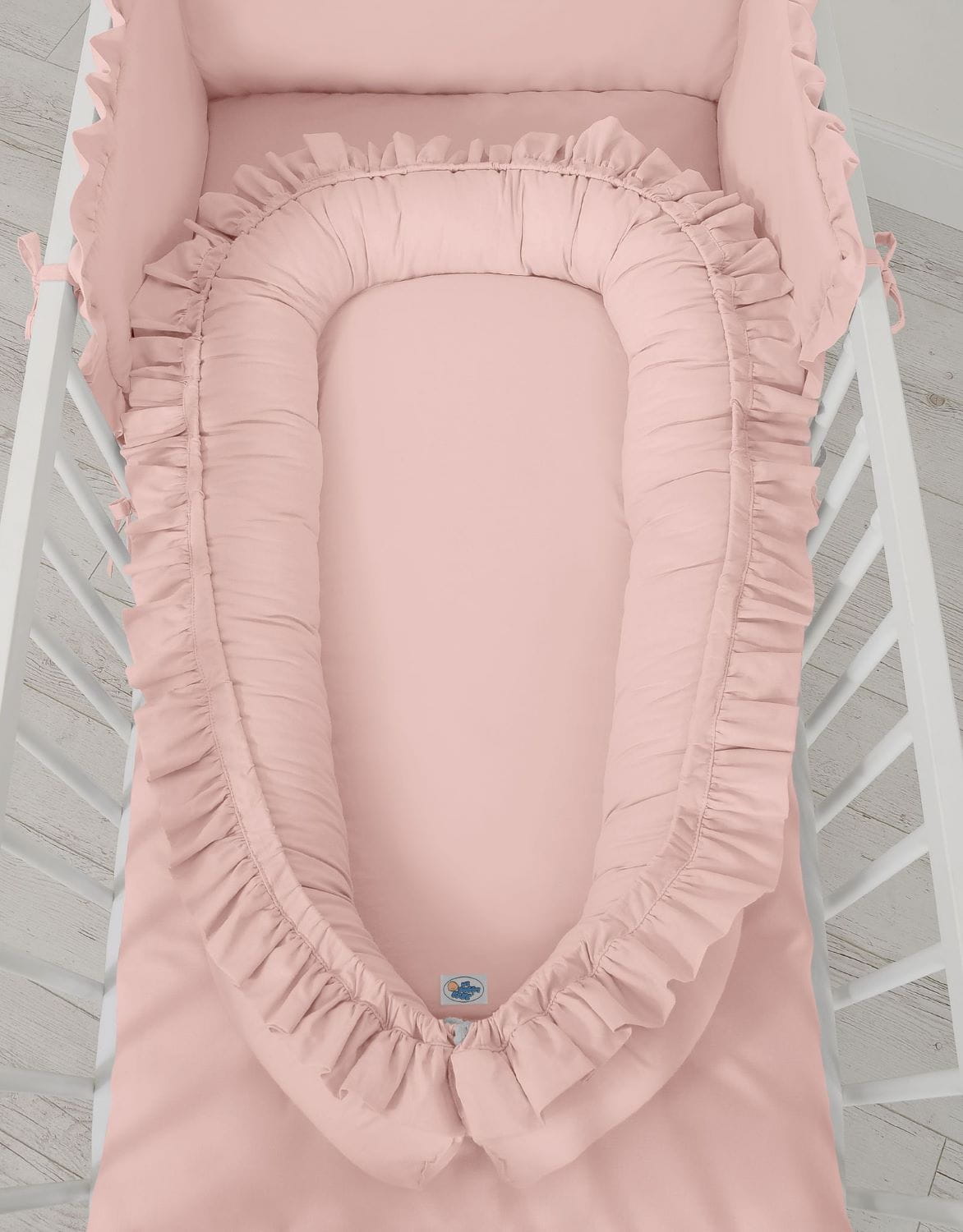 Kokon niemowlęcy z falbanką to eleganckie i funkcjonalne akcesorium, które idealnie sprawdza się jako miejsce do spania i wypoczynku dla noworodka i niemowlęcia. Dzięki kompaktowym wymiarom i przytulnemu kształtowi, kokon jest bardziej komfortowy i bezpieczniejszy dla dziecka niż klasyczne łóżeczko, umożliwiając mu poczuć się jak w łonie matki. Wewnętrzna przestrzeń jest celowo ograniczona, by pomóc dziecku stopniowo przejść z pozycji embrionalnej do bardziej wyprostowanej postawy w miarę rozwoju.