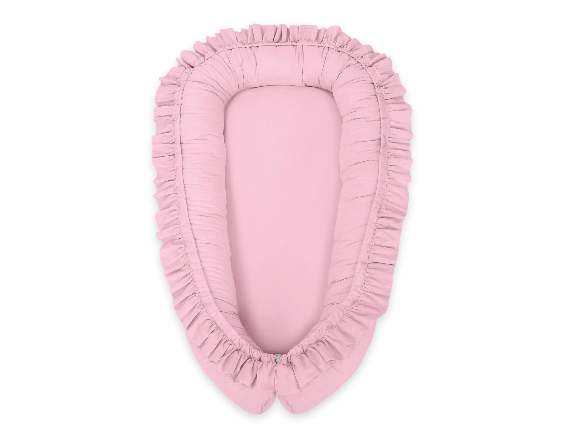 Kokon niemowlęcy z falbanką to eleganckie i funkcjonalne akcesorium, które idealnie sprawdza się jako miejsce do spania i wypoczynku dla noworodka i niemowlęcia. Dzięki kompaktowym wymiarom i przytulnemu kształtowi, kokon jest bardziej komfortowy i bezpieczniejszy dla dziecka niż klasyczne łóżeczko, umożliwiając mu poczuć się jak w łonie matki. Wewnętrzna przestrzeń jest celowo ograniczona, by pomóc dziecku stopniowo przejść z pozycji embrionalnej do bardziej wyprostowanej postawy w miarę rozwoju.