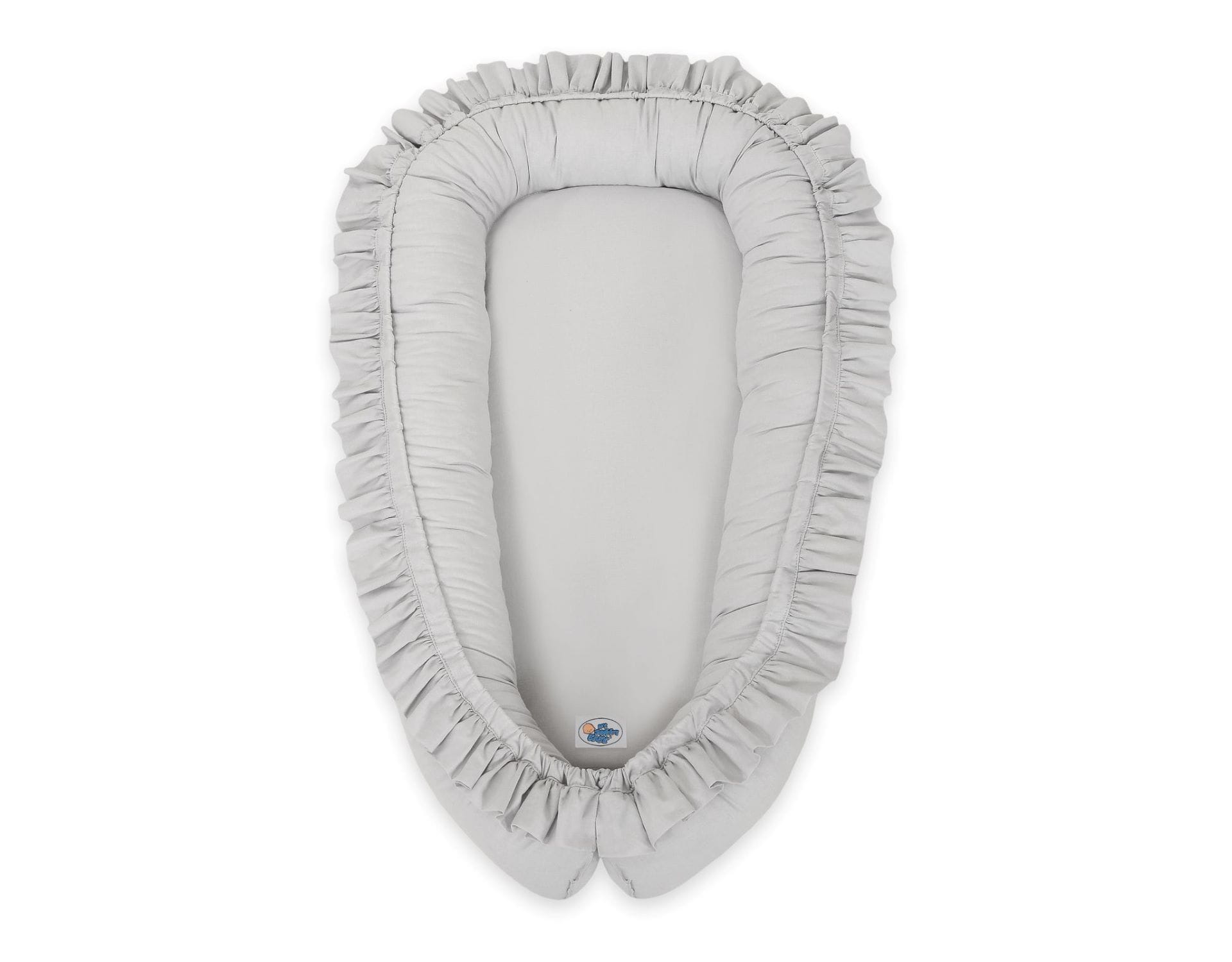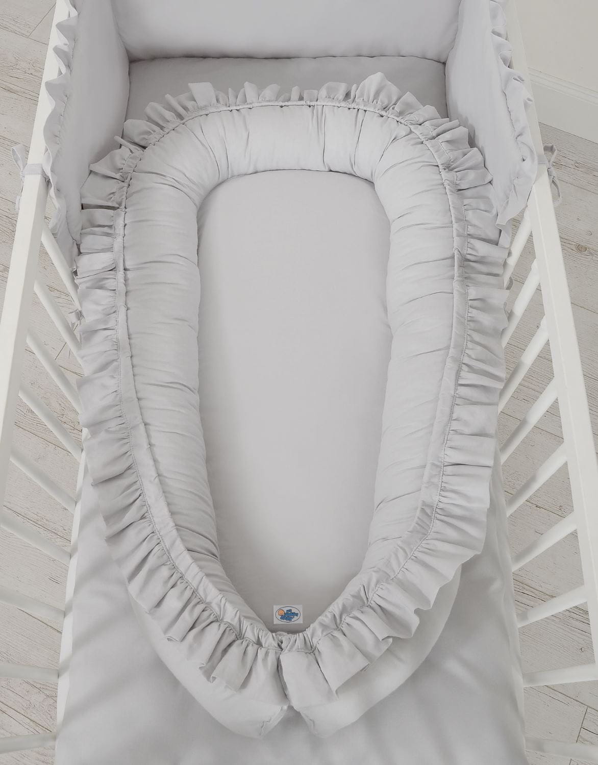 Kokon niemowlęcy z falbanką to eleganckie i funkcjonalne akcesorium, które idealnie sprawdza się jako miejsce do spania i wypoczynku dla noworodka i niemowlęcia. Dzięki kompaktowym wymiarom i przytulnemu kształtowi, kokon jest bardziej komfortowy i bezpieczniejszy dla dziecka niż klasyczne łóżeczko, umożliwiając mu poczuć się jak w łonie matki. Wewnętrzna przestrzeń jest celowo ograniczona, by pomóc dziecku stopniowo przejść z pozycji embrionalnej do bardziej wyprostowanej postawy w miarę rozwoju.