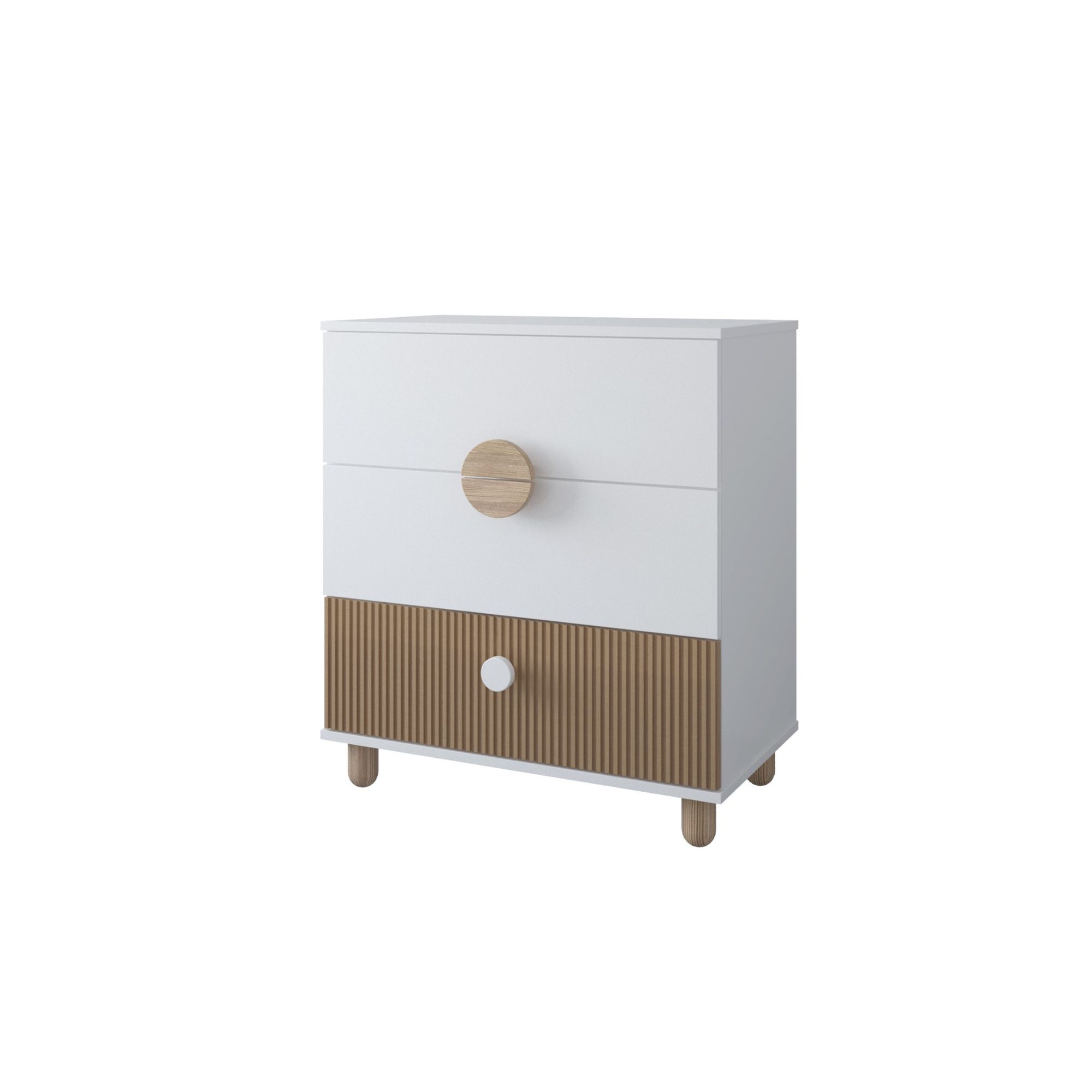 Biała komoda dziecięca Cocolo to praktyczny mebel do pokoju niemowlęcia i starszaka, który pomoże uporządkować ubranka, tekstylia i drobiazgi dziecka. Dwie pojemne szuflady, ryflowany front dolnej szuflady oraz bukowe nóżki i uchwyty tworzą nowoczesny, a jednocześnie przytulny komplet z innymi meblami z kolekcji Cocolo – łóżeczkiem, szafą czy komodą z przewijakiem. Neutralna biel dobrze komponuje się z pastelami i mocniejszymi kolorami, więc sprawdzi się zarówno w pokoju dziewczynki, jak i chłopczyka.