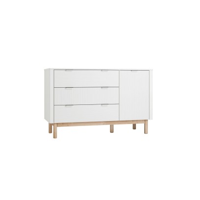 Biała komoda Miloo z szufladami i drzwiami to mebel, który sprawdzi się zarówno w pokoju niemowlęcia, jak i w pokoju nastolatka. Czyste fronty w kolorze bieli, ryflowany wzór, subtelne metalowe uchwyty oraz bukowe nóżki sprawiają, że komoda wygląda lekko i nowocześnie, a przy tym pozostaje ponadczasowa. W połączeniu z innymi meblami z kolekcji Miloo – łóżkiem, szafą, regałem czy biurkiem – pozwala stworzyć spójny zestaw mebli dziecięcych i młodzieżowych na lata.