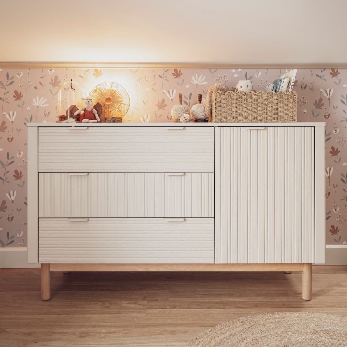 Szampańska komoda dziecięca i młodzieżowa Miloo dobrze odnajduje się we wnętrzach w stylu boho, skandynawskim i naturalnym, tworząc przytulne tło dla reszty mebli.