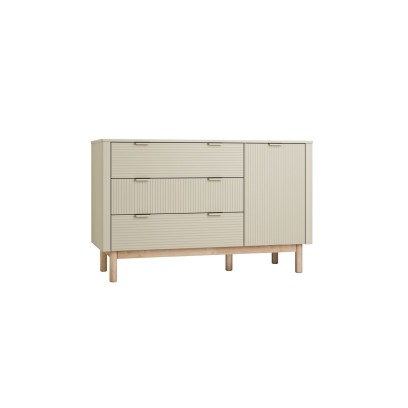 Szampańska komoda Miloo z szufladami i drzwiami wprowadza do pokoju dziecka ciepło i spokój. Delikatny, beżowo-szampański odcień, ryflowane fronty, subtelne metalowe uchwyty oraz bukowe nóżki tworzą elegancki, ale przyjazny mebel, który pasuje i do pokoju niemowlęcia, i do pokoju nastolatka. Jeśli tworzysz spójną aranżację, możesz dobrać także łóżko, szafę, regał i biurko z kolekcji Miloo, budując kompletne wyposażenie pokoju w jednym stylu.