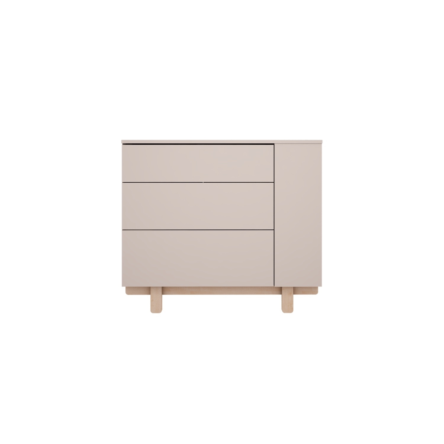 Komoda z przewijakiem Basic kaszmir 3w1 łączy w sobie komodę z trzema szufladami, boczny regał oraz stabilny przewijak montowany na blacie. W jednym meblu zyskujesz miejsce na ubranka, pieluszki, kosmetyki i tekstylia, dzięki czemu cały kącik do przewijania niemowlaka masz doskonale zorganizowany. Delikatny, neutralny kolor kaszmir (NCS S2002-Y50R) wprowadza do pokoju ciepło i spokój, pasując zarówno do aranżacji dla chłopca, jak i dziewczynki. To świetny wybór, jeśli szukasz funkcjonalnej komody z przewijakiem, która po kilku latach zamieni się w klasyczną komodę z regałem.