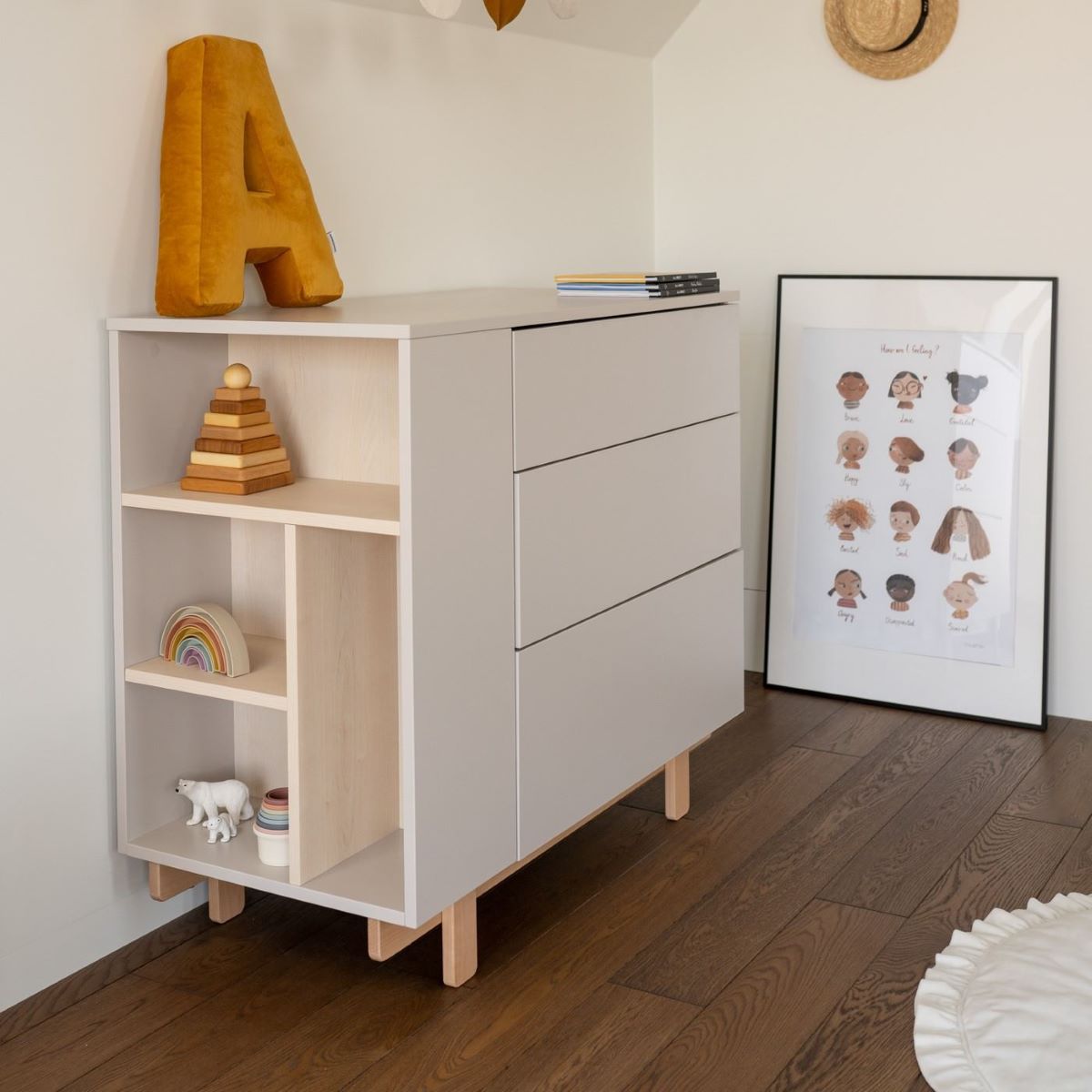 Tak wykończona komoda pięknie łączy się z drewnianymi nogami i pozostałymi meblami z kolekcji Basic, tworząc spójny zestaw na lata – od pokoju niemowlaka po bardziej młodzieżowy wystrój.