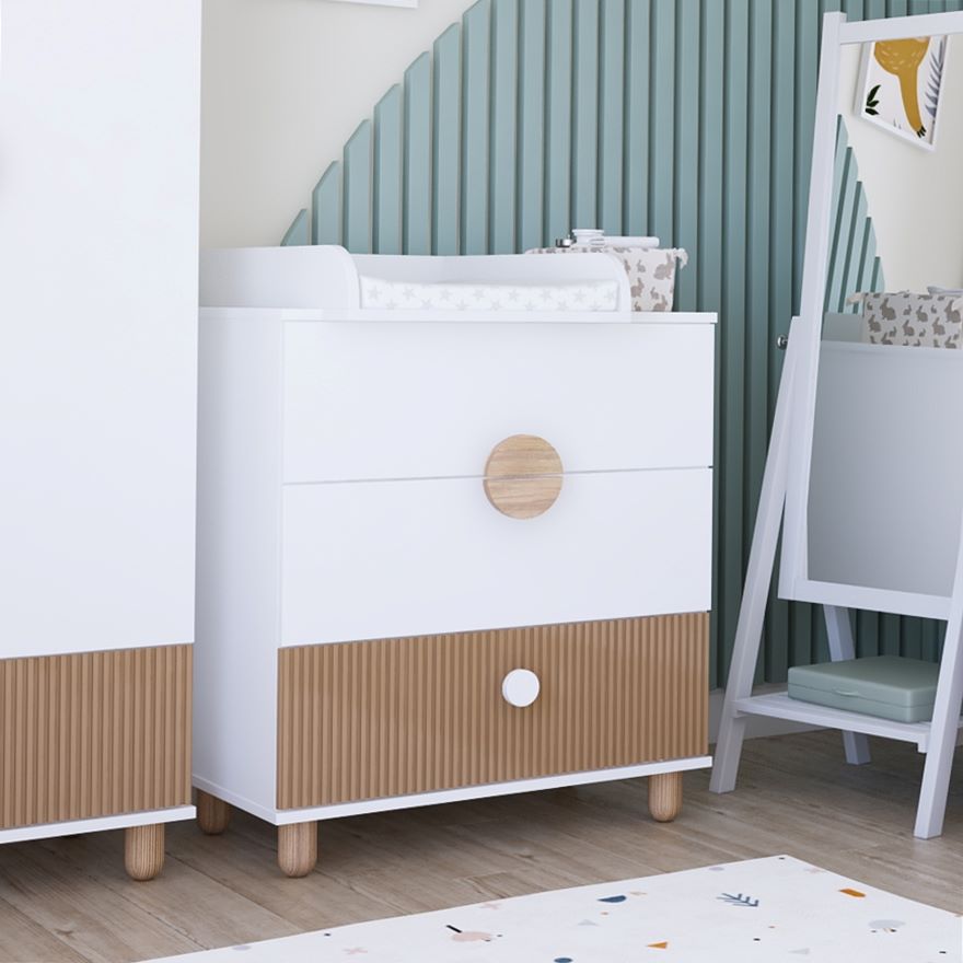 Ryflowany front dolnej szuflady i okrągłe uchwyty nadają meblowi wyjątkowego charakteru. Komoda pięknie wygląda w zestawie z łóżeczkiem Cocolo, szafą czy szafką nocną, tworząc spójny komplet mebli dziecięcych na lata.