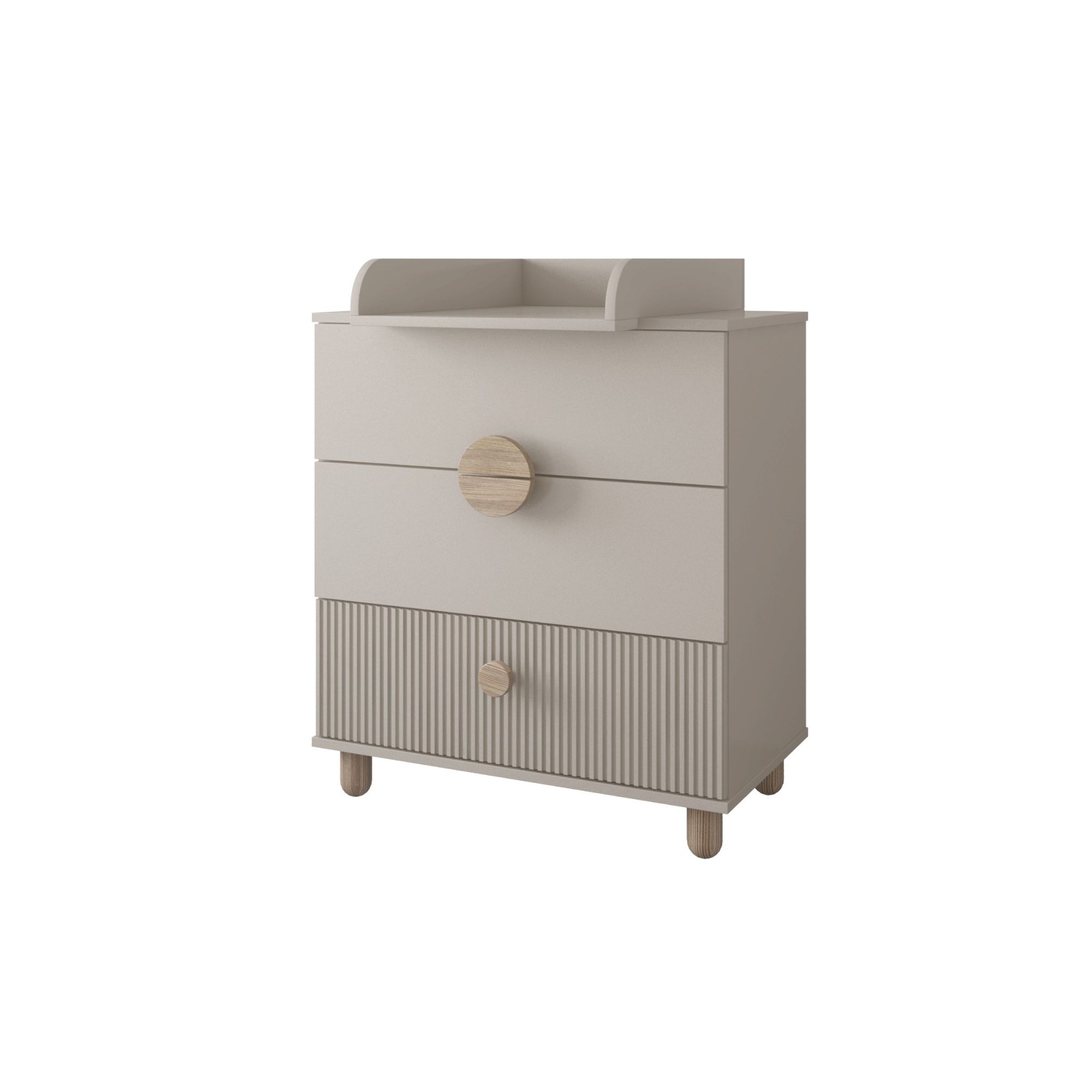 Dzięki ryflowanemu frontowi dolnej szuflady i drewnianym detalom komoda Cocolo kaszmir tworzy spójny zestaw z łóżeczkiem, szafą i szafką nocną z tej samej kolekcji, budując harmonijny komplet mebli dziecięcych.