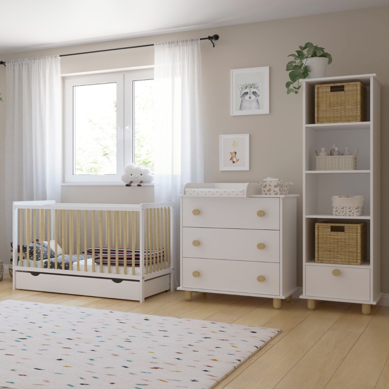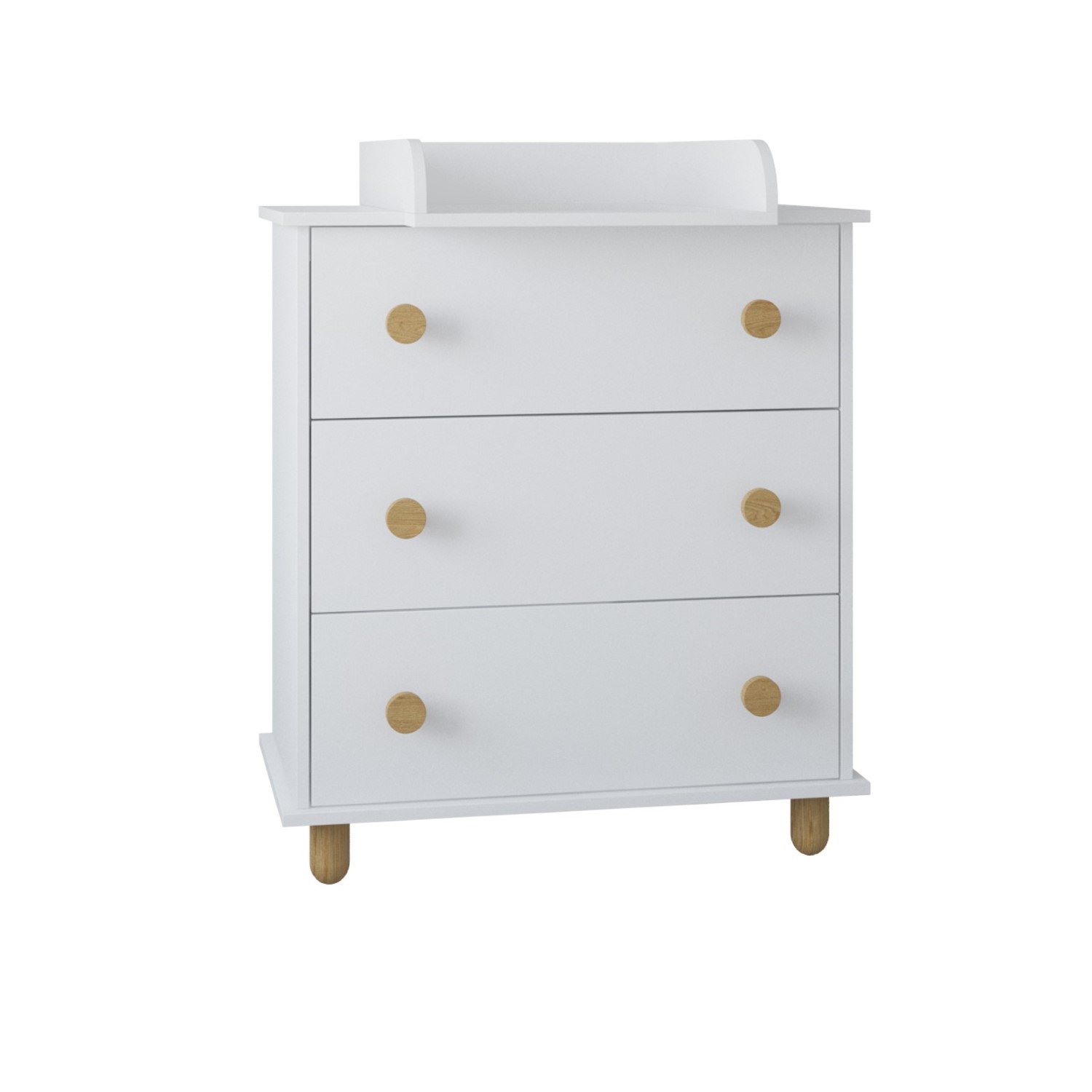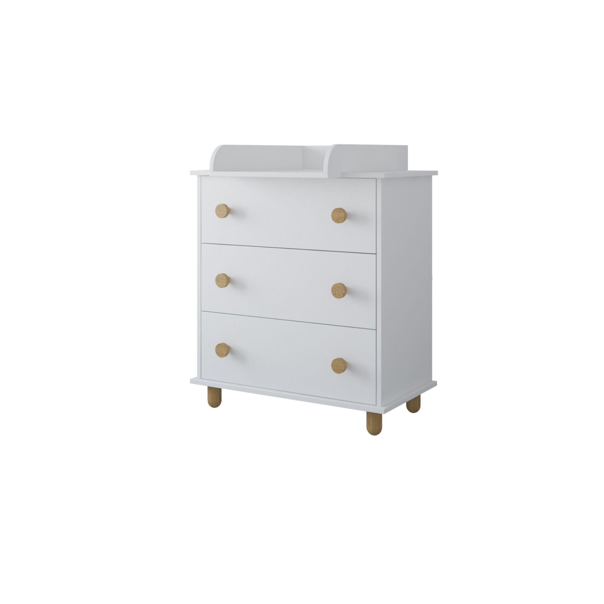 Komoda z przewijakiem Lilo biała łączy w sobie funkcję wygodnego miejsca do przewijania niemowlęcia oraz pojemnej komody z trzema szufladami. Dzięki neutralnej bieli frontów oraz okrągłym uchwytom i nóżkom z naturalnego drewna bukowego idealnie wpisuje się w aranżację nowoczesnego pokoju dziecka. Komoda doskonale komponuje się z łóżeczkiem Lilo, tworząc spójną strefę snu, przechowywania i pielęgnacji – wszystko, czego potrzebujesz w pierwszych miesiącach życia malucha.