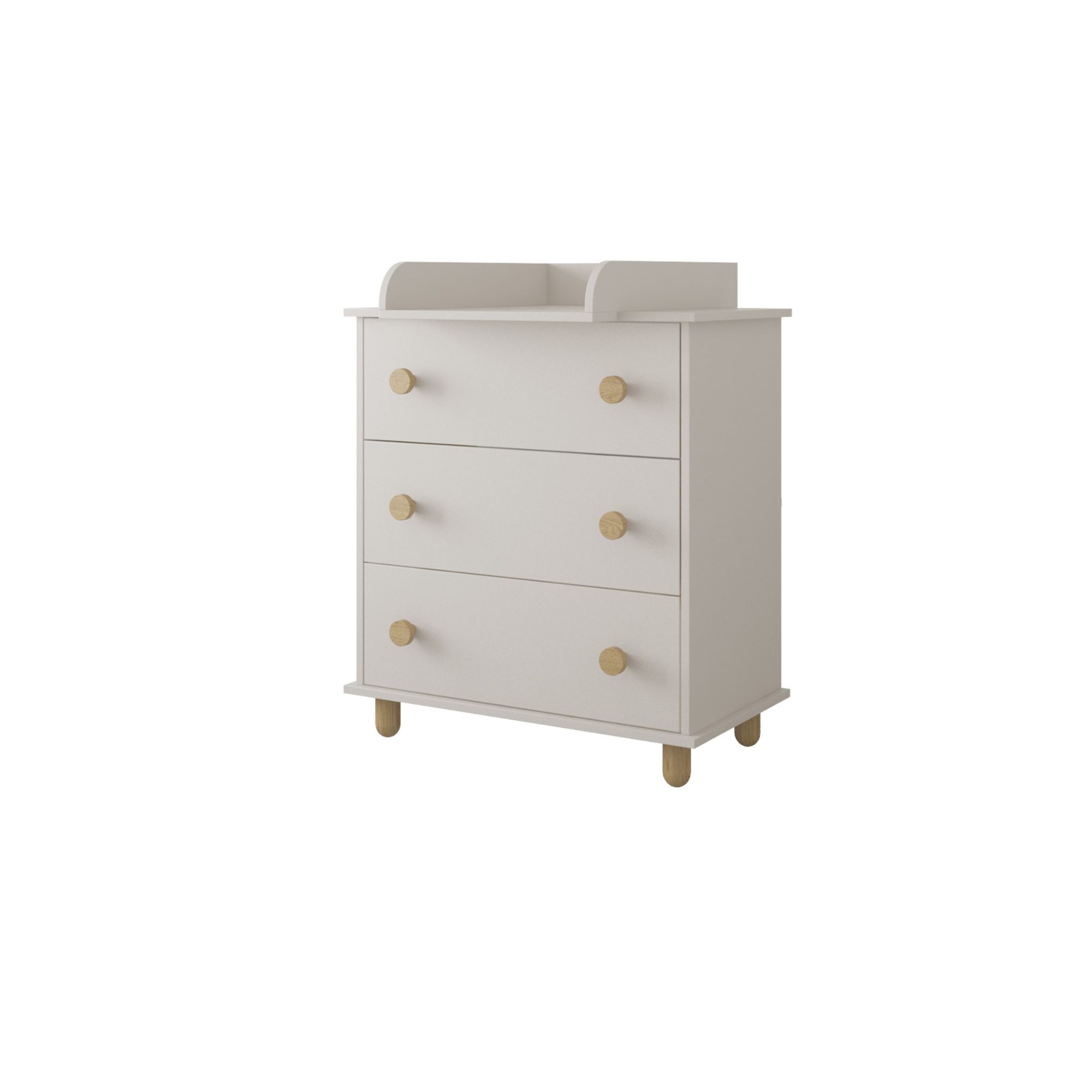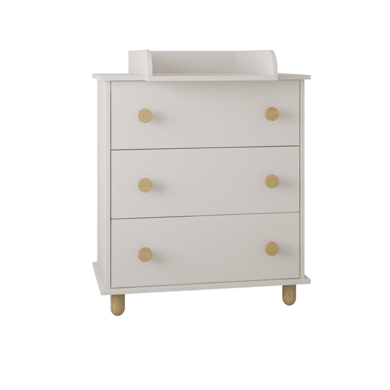 Dzięki drewnianym, okrągłym uchwytom i nogom z litego buku komoda wygląda lekko, a jednocześnie przytulnie – idealnie do pierwszej strefy pielęgnacji dziecka.