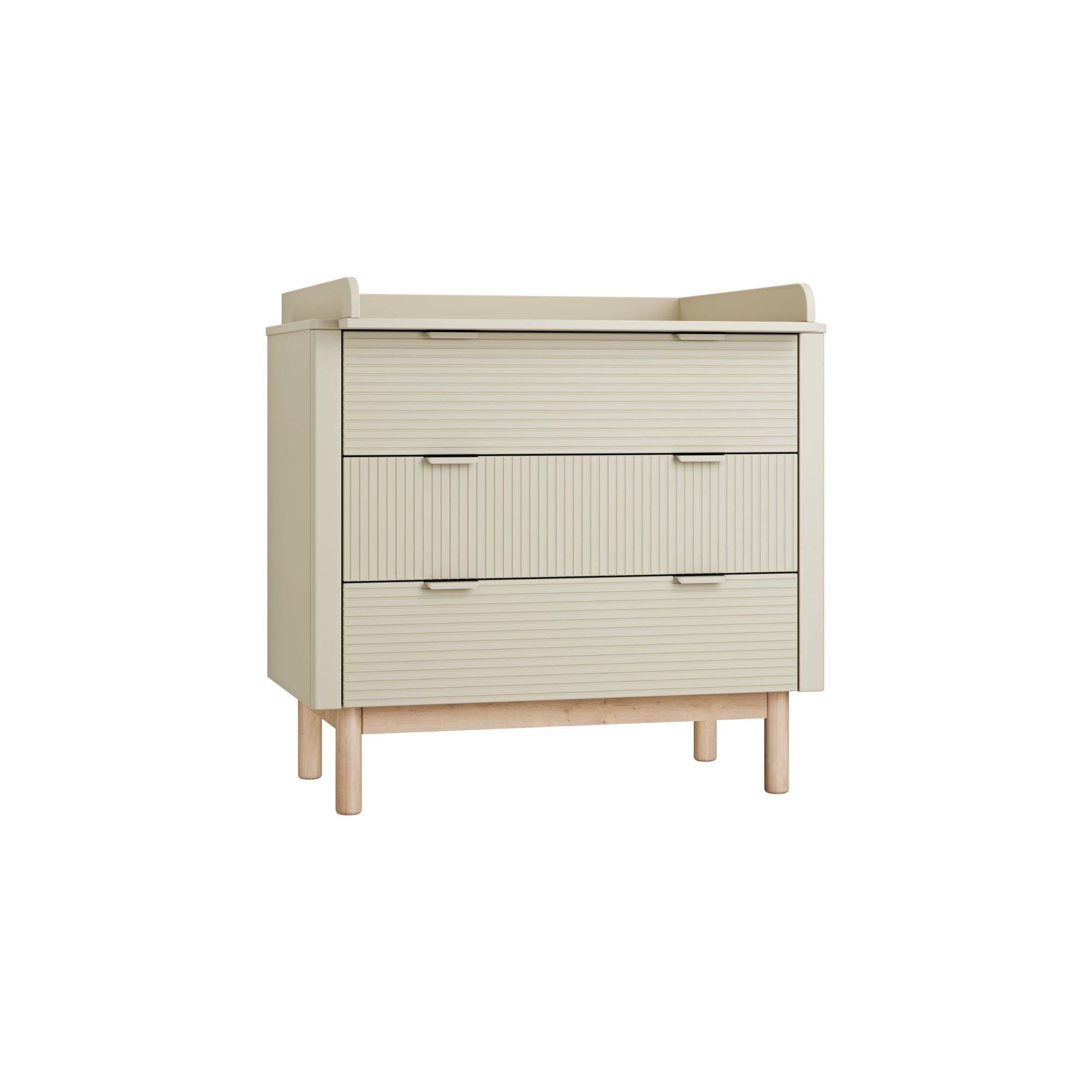 Szampańska komoda z przewijakiem Miloo porządkuje wszystko, co potrzebne przy codziennej pielęgnacji maluszka. Na blacie z nakładką ustawisz przewijak i kosmetyki, a 3 pojemne szuflady pomieszczą ubranka, pieluszki i tekstylia. Delikatny szampański odcień, ryflowane fronty i bukowe nóżki tworzą spokojne, przytulne tło dla pierwszych miesięcy w pokoju dziecka. Komoda należy do kolekcji mebli dziecięcych Miloo, dzięki czemu bez trudu skompletujesz spójny zestaw do całego pokoju.