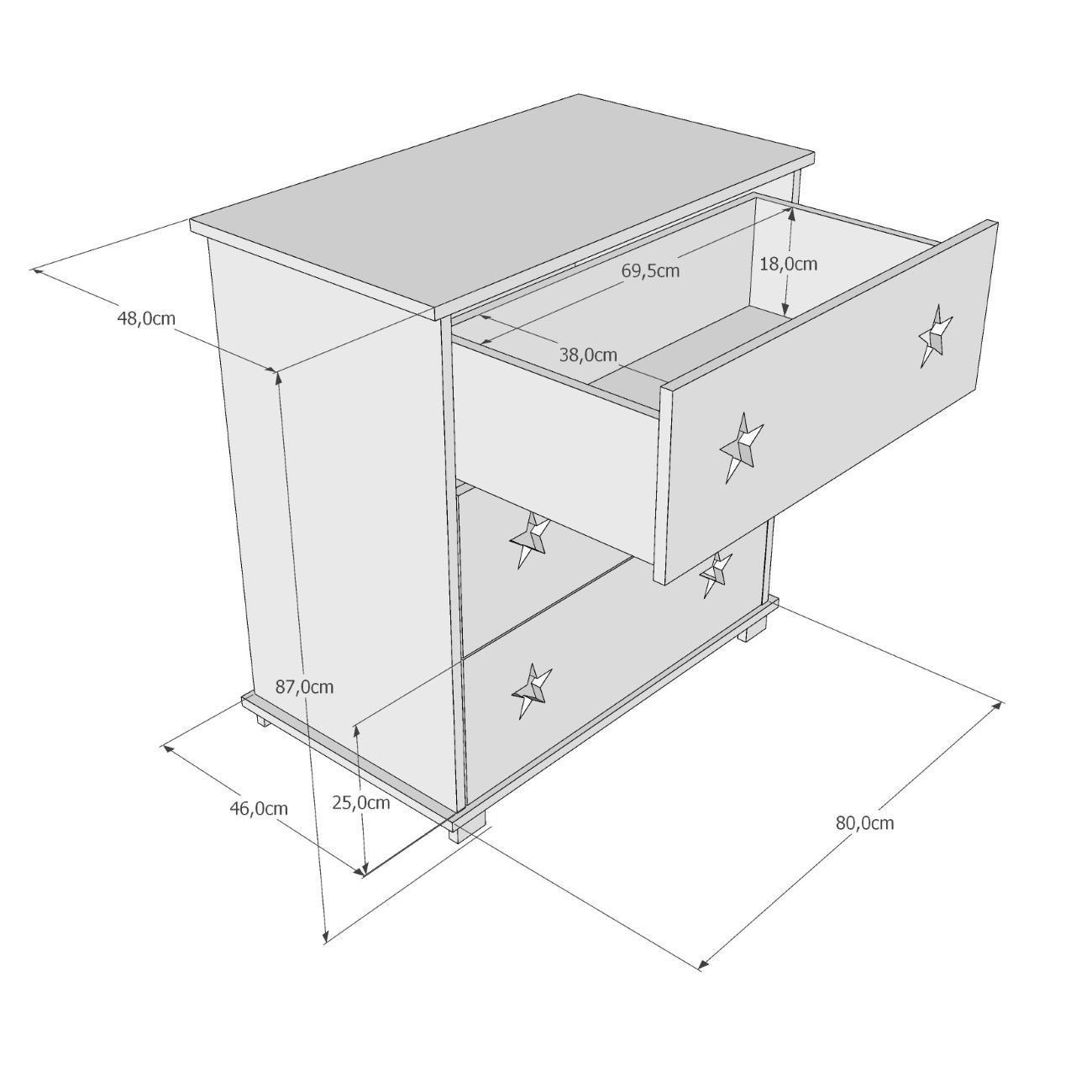 Komoda z przewijakiem Stars wykonana jest z płyty meblowej, co zapewnia stabilność i trwałość podczas codziennego użytkowania. Krawędzie są starannie wykończone, a bryła przystosowana do ustawienia przy łóżeczku lub wzdłuż ściany w pokoju dziecka.