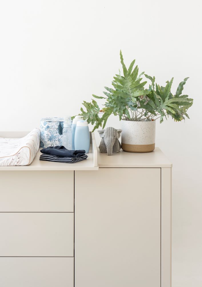 Nakładka na przewijak jest montowana na blacie i można ją w przyszłości łatwo zdemontować. Po zakończeniu etapu pieluch komoda zyskuje ponadczasowy wygląd mebla do przechowywania: