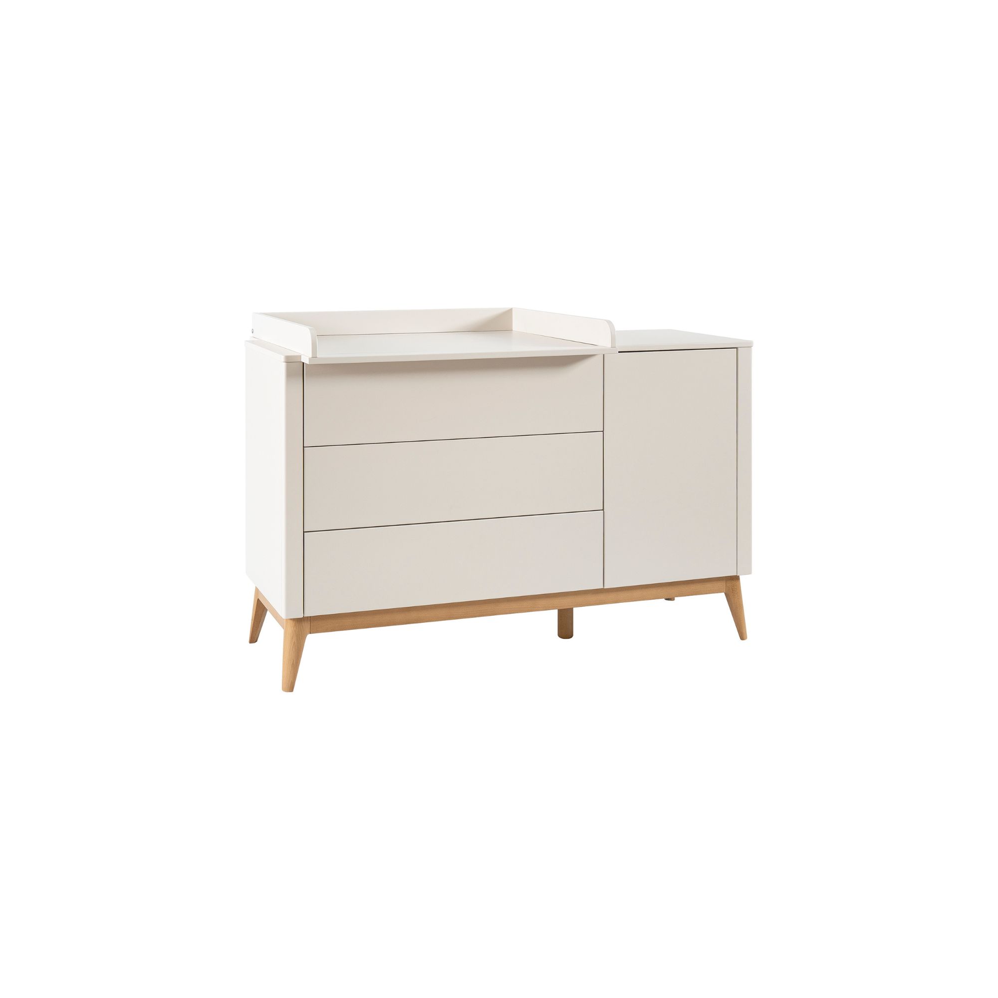 Komoda z szafką i przewijakiem Seth łączy funkcję wygodnego przewijaka z pojemną komodą dziecięcą. Delikatny, szampański kolor i bukowe nóżki w stylu skandynawskim sprawiają, że mebel idealnie pasuje do jasnego, spokojnego pokoju niemowlęcia. Trzy szerokie szuflady, dodatkowa szafka oraz blat z nakładką tworzą praktyczne centrum pielęgnacji dziecka, które możesz łatwo połączyć z pozostałymi meblami dziecięcymi z kolekcji Seth.