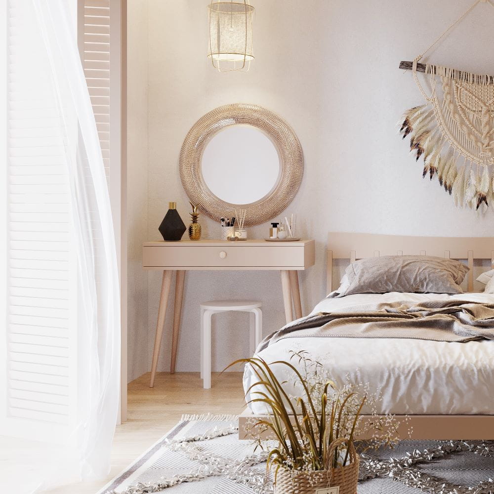 Wysokie drewniane nogi konsoli nie tylko nadają jej lekkości i elegancji, ale także pozwalają na wsunięcie pod blat siedziska, co jest praktycznym rozwiązaniem, pozwalającym zaoszczędzić przestrzeń w pokoju. Taki układ sprzyja organizacji i utrzymaniu porządku, jednocześnie tworząc funkcjonalną i estetyczną przestrzeń do nauki, pielęgnacji czy kreatywnych zajęć.