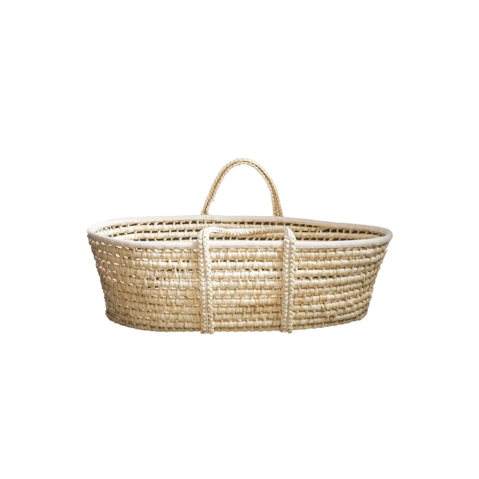 Kosz Mojżesza to wyjątkowy, ręcznie pleciony produkt, wykonany z naturalnego materiału, jakim jest łuska kukurydziana. Dzięki precyzyjnej ręcznej pracy, każdy kosz jest unikalny i wyróżnia się swoją trwałością oraz estetyką. Łuska kukurydziana nie tylko nadaje koszowi piękny, rustykalny wygląd, ale także sprawia, że jest on lekki i łatwy w przenoszeniu. Dodatkowo, kosz został wykończony delikatną, materiałową tasiemką, która wzmacnia konstrukcję, zapewniając dodatkową trwałość i estetyczny akcent.