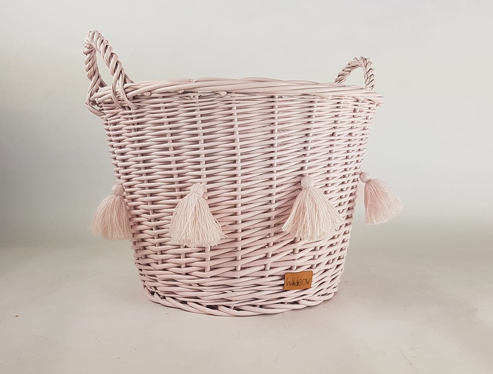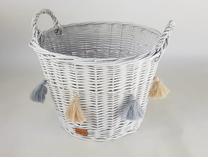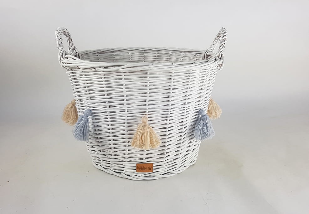 Kosz z wikliny ozdobiony miękkimi kolorowymi chwostami z akrylu. Piękny i praktyczny dodatek do pokoju dziewczynki w każdym wieku. Dla tej młodszej może być koszem na maskotki, dla nastolatki - miejscem na osobiste przedmioty. Wiklinowy kosz wyposażony jest w uchwyty ułatwiające przenoszenie go i ustawianie w wybranym miejscu. Kosz pomalowany jest ekologiczną farbą na kolor biały lub różowy, a dedykowane do niego chwosty występują w pięciu kolorach, które można wybrać spośród podanych. Pozwala to stworzyć własną kompozycję, która podkreśli wystrój pokoju dziewczynki.