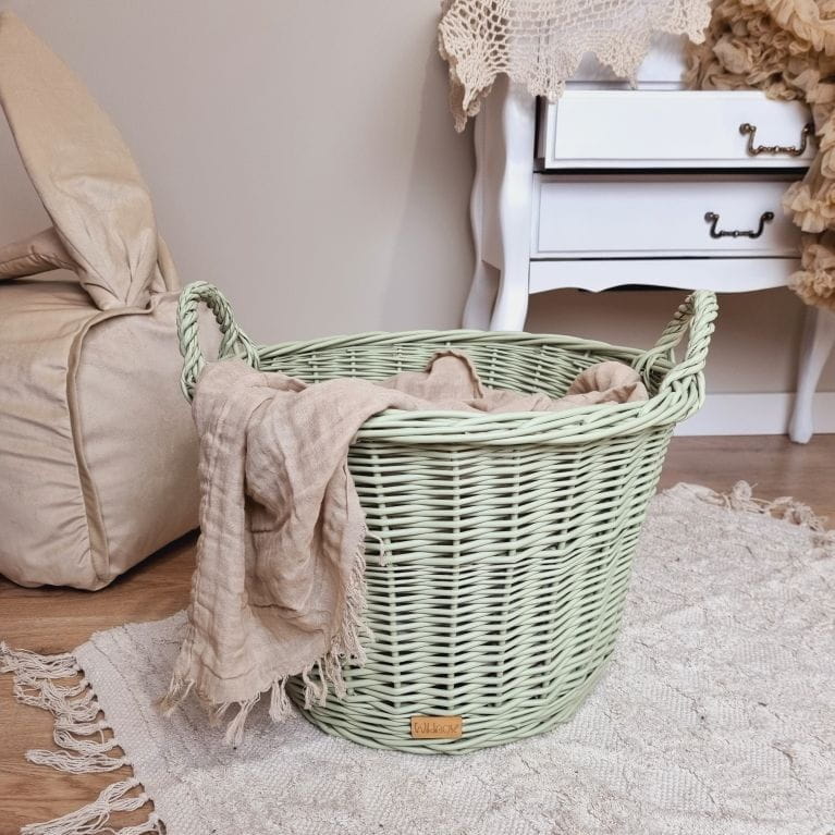 Śliczny kosz wiklinowy do pokoju dziecięcego i młodzieżowego. W tym pierwszym, będzie idealnym miejscem by schować zabawki, w tym drugim - może pełnić funkcję czysto dekoracyjną...choć można też w nim ułożyć ukochanego misia z dzieciństwa:) Ręcznie pleciony kosz z wikliny pomalowany jest ekologiczną farbą w kolorze białym lub trzech pastelowych, dzięki czemu zawsze zostanie odpowiednio dobrany do wystroju pokoju dziecka. Kosz wyposażony jest w wytrzymałe uchwyty przypominające uszy, które ułatwiają jego przenoszenie.