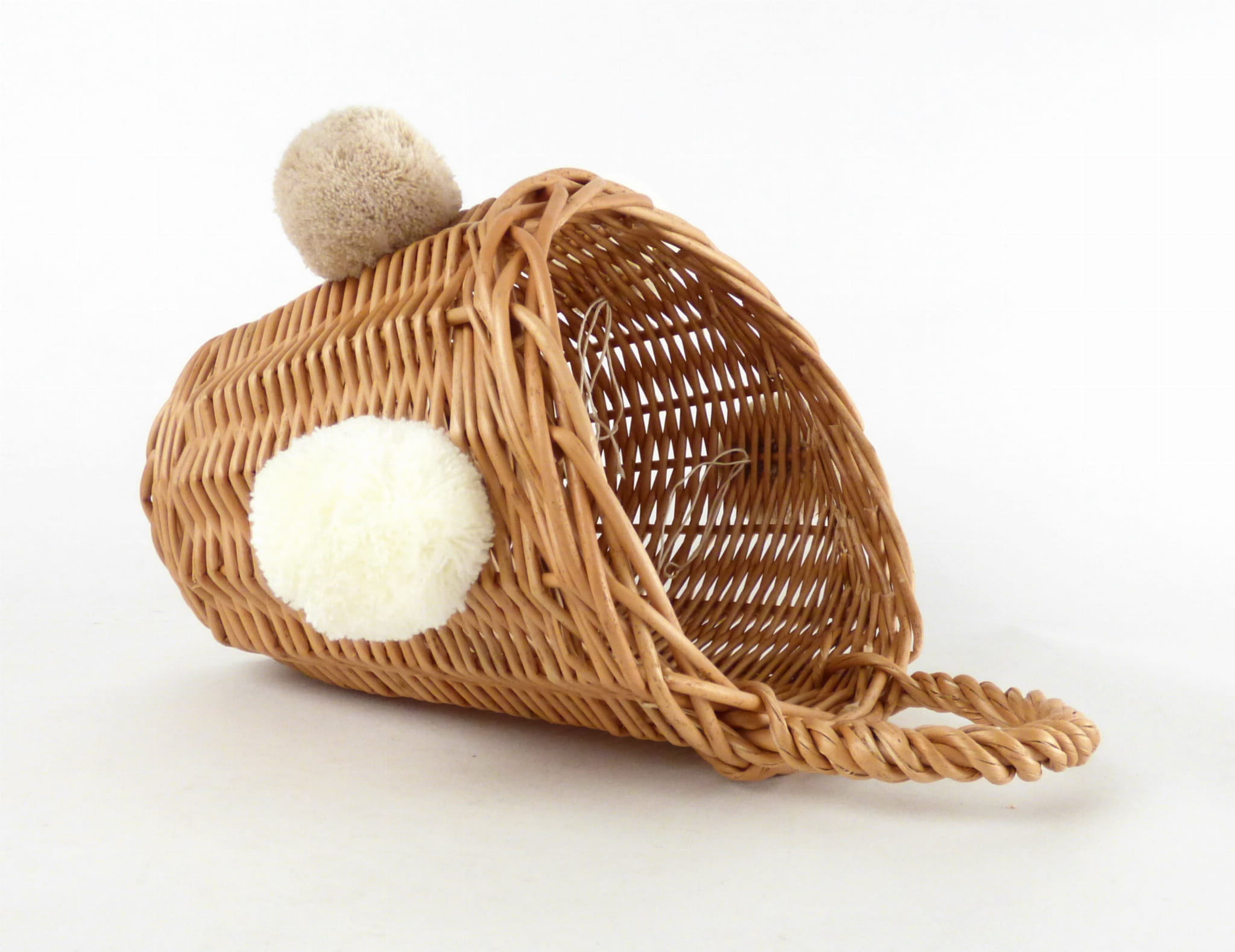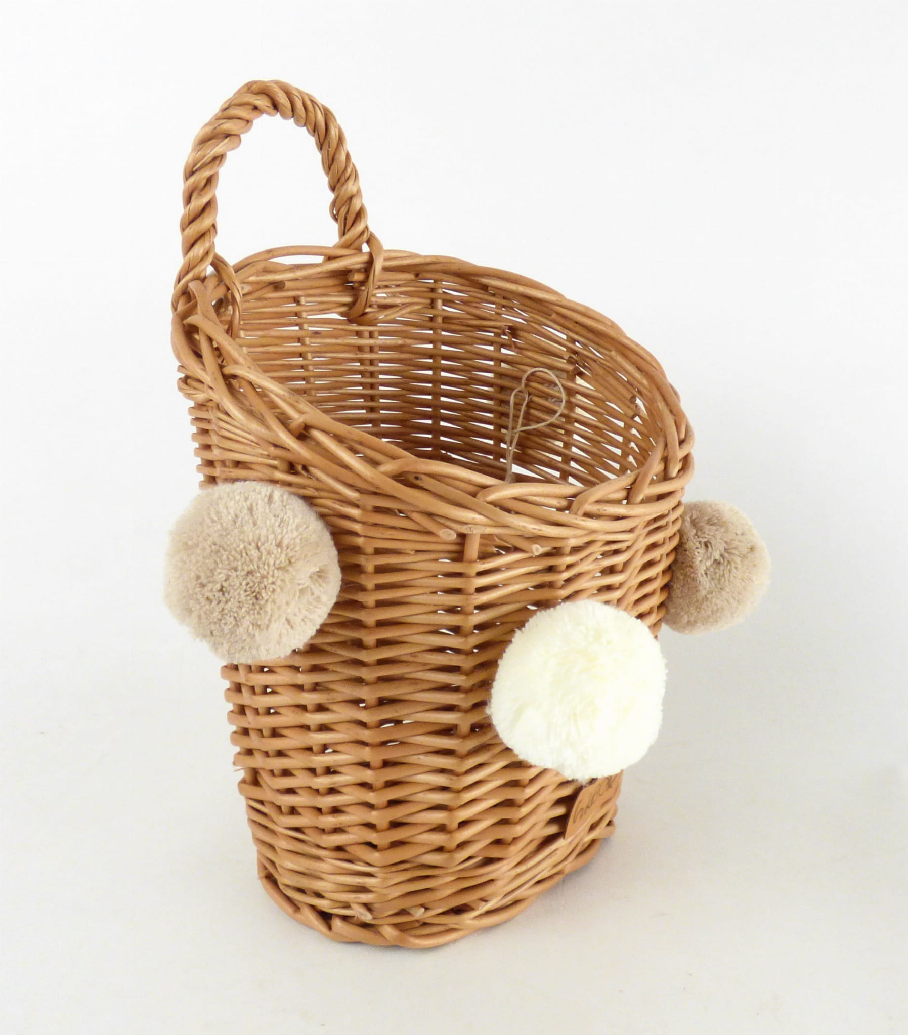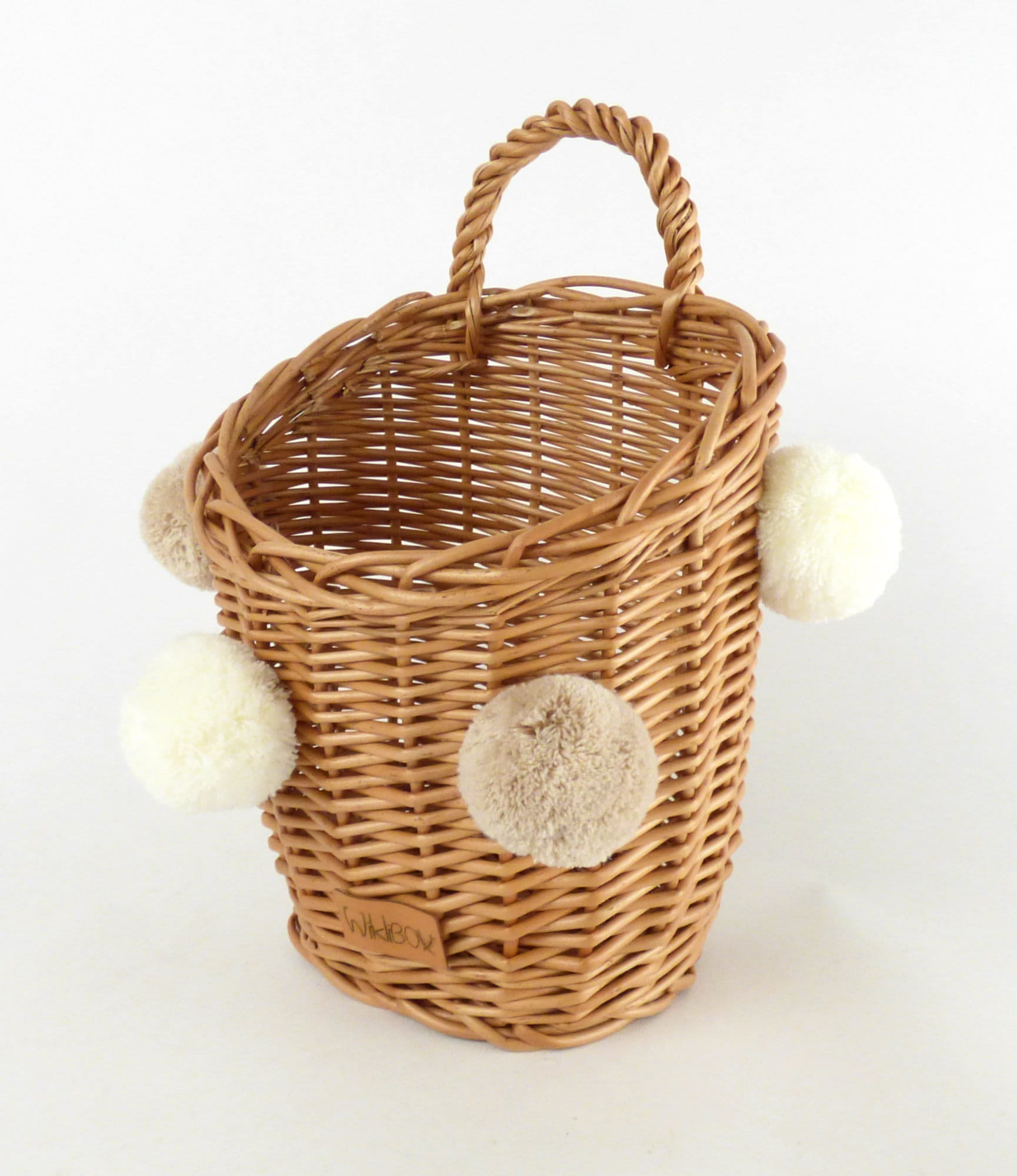 Niewielki, śliczny i praktyczny koszyk na ścianę. Koszyk do zawieszenia ręcznie wyplatany z najwyższej jakości polskiej wikliny, ozdobiony czteroma miękkimi pomponami będzie ciekawym i oryginalnym dodatkiem do pokoju dziecka. Koszyk wiklinowy w pokoju niemowlęcym zawieszony nad przewijakiem może służyć jako pojemniczek na przybory toaletowe dla maluszka, w pokoju starszego dziecka jako miejsce przechowywania skarbów. Świetnie się sprawdzi również w pokoju młodzieżowym służąc jako koszyk na drobiazgi: klucze, ładowarkę do telefonu, etc.