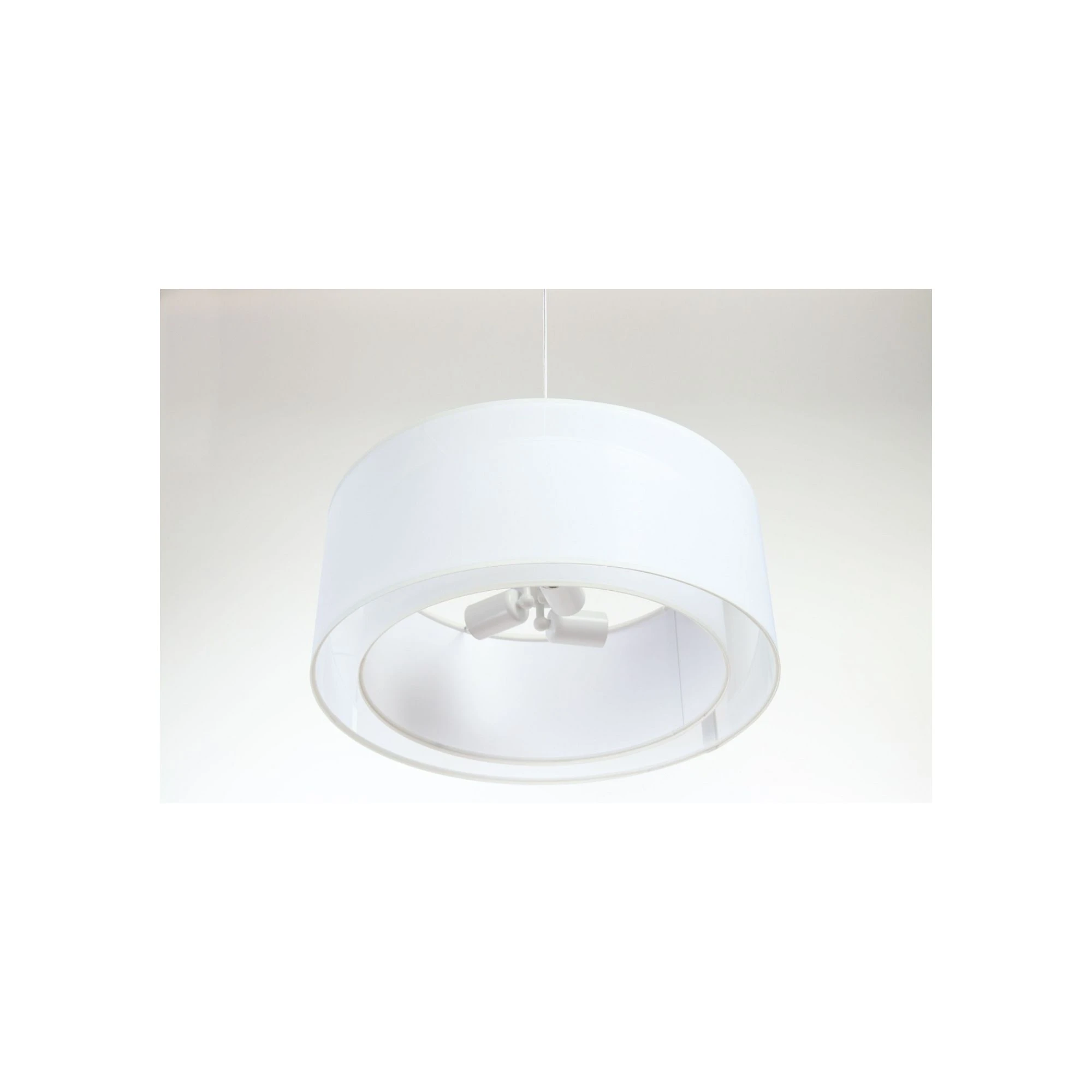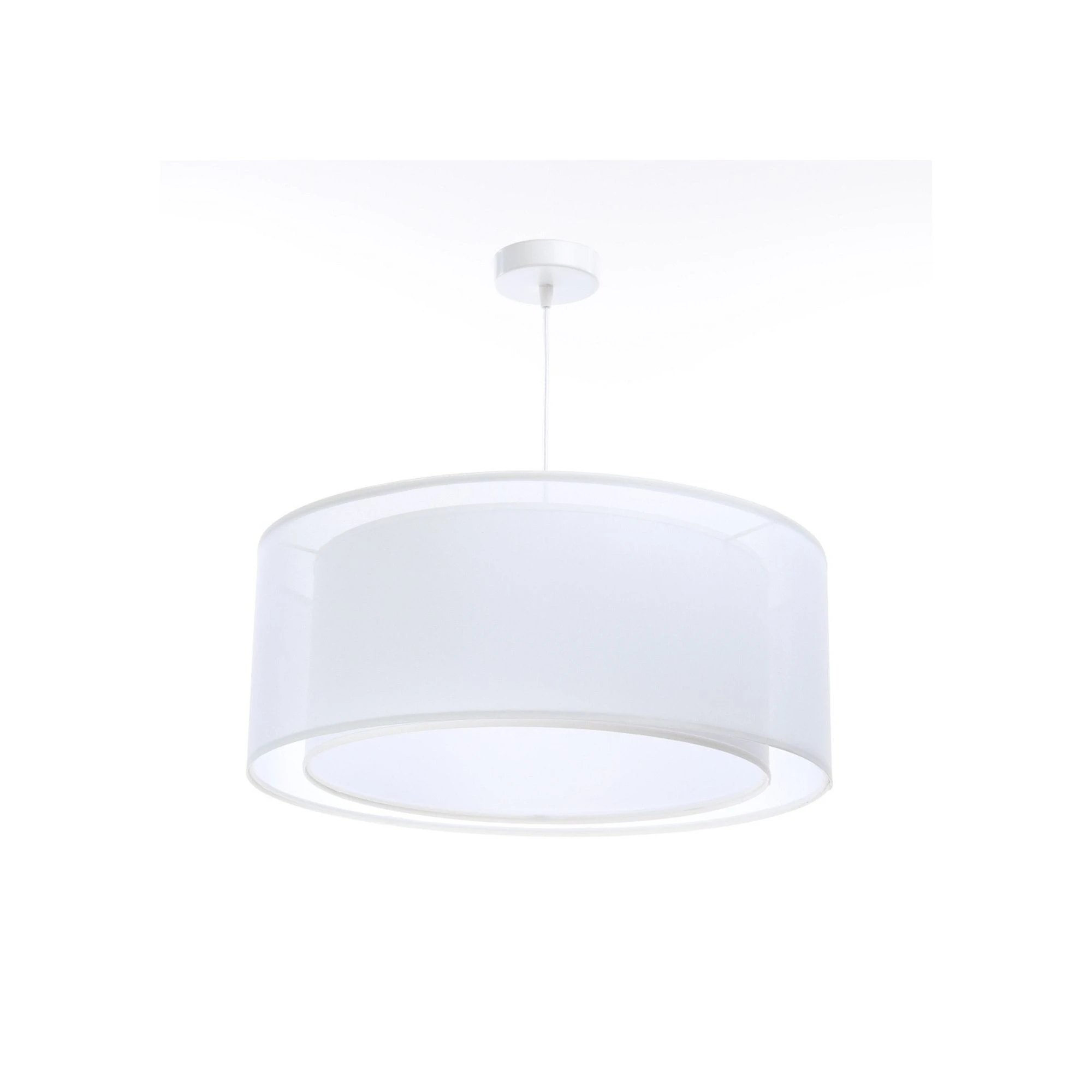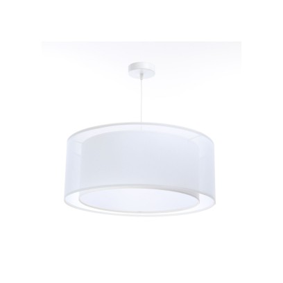 Abażur w kształcie dwuściennego walca został wykonany z tworzywa PCV z półprzezroczystą tkaniną, dzięki czemu lampa wygląda subtelnie i lekko. To model, który nie przytłacza wnętrza, a jednocześnie stanowi estetyczne, główne źródło oświetlenia.