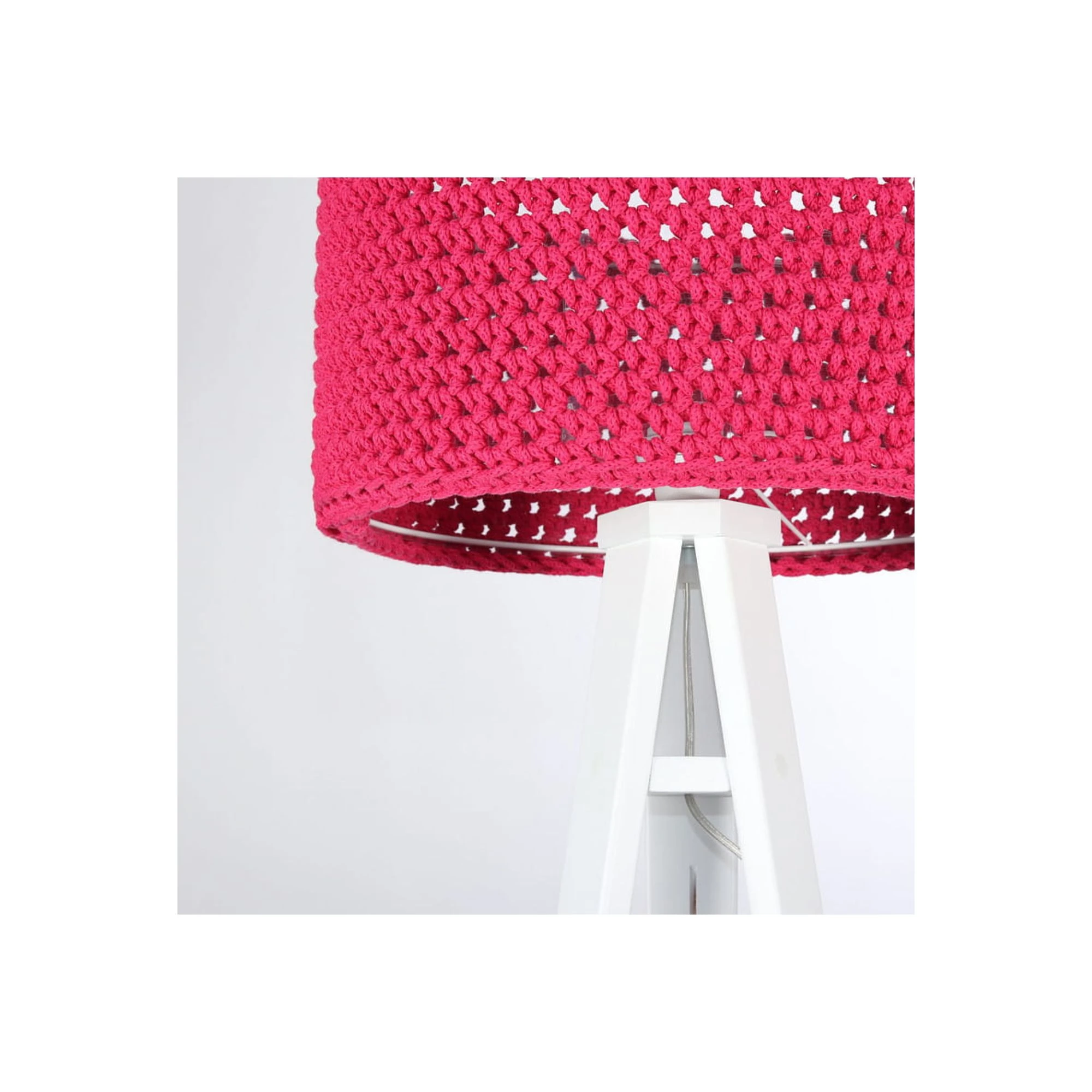 Ten model świetnie sprawdza się tam, gdzie kolor ma budować klimat aranżacji. Malinowy abażur o wyrazistym splocie ożywia pokój dziecka i staje się mocnym, ale nadal estetycznym akcentem. Dzięki zestawieniu z białym drewnianym trójnogiem lampa wygląda nowocześnie, lekko i nie przytłacza przestrzeni.