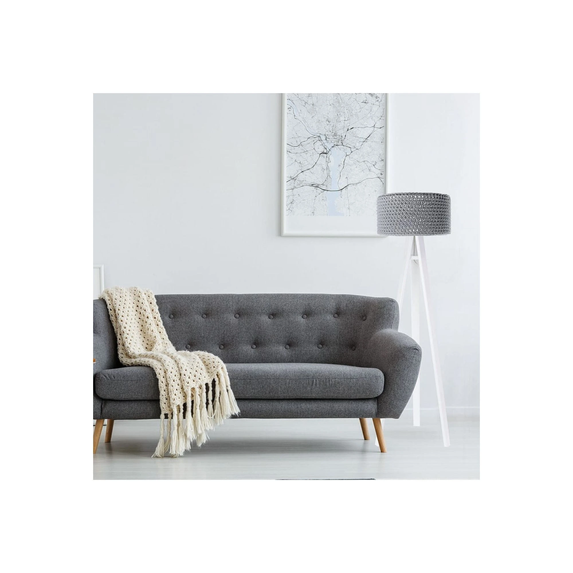 Lampa podłogowa Splot szary to świetny wybór do wnętrz, w których liczy się prostota, faktura i spokojna kolorystyka. Szary abażur dobrze wpisuje się w nowoczesny pokój nastolatka, a całość wygląda lekko dzięki białemu drewnianemu trójnogowi. W dedekids.pl zamówisz ten model z darmową dostawą.