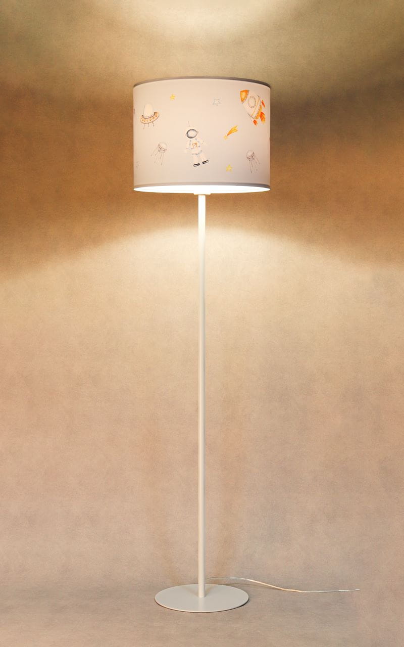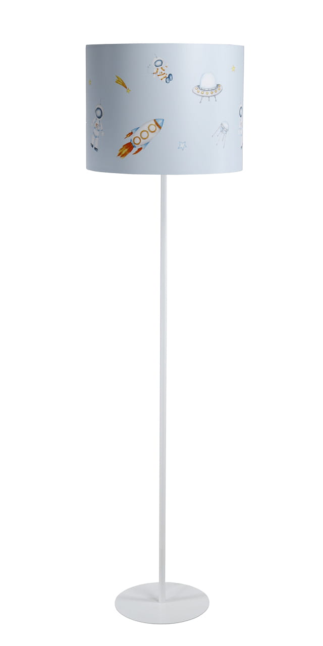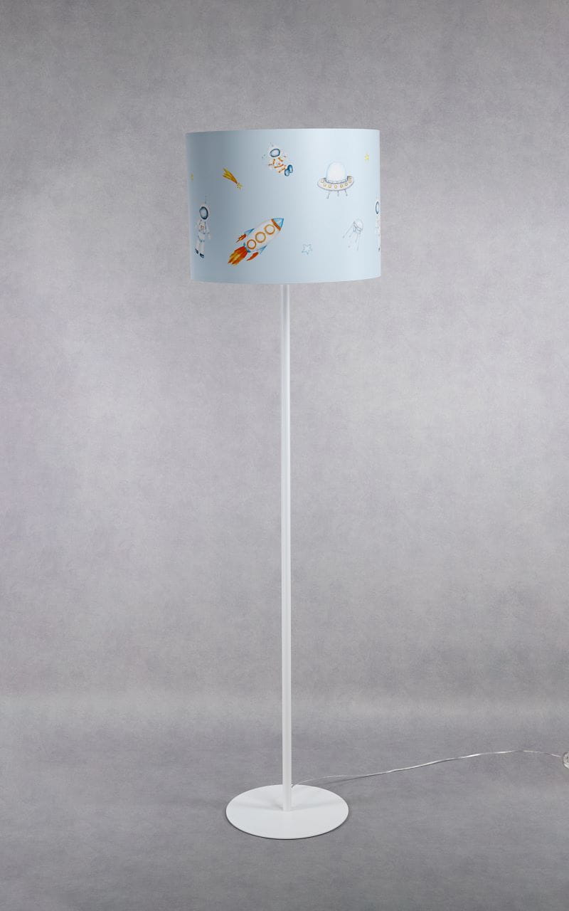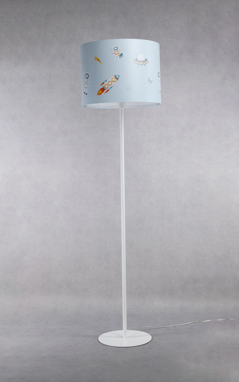 Lampa podłogowa do pokoju chłopca będąca częścią kolekcji lamp Sweet Dreams. Podobnie jak pozostałe lampy z kolekcji, abażur lampy pokrywa lateksowy nadruk ze statkami i pojazdami kosmicznymi. Lampa podłogowa świetnie sprawdzi się jako źródło dodatkowego oświetlenia pokoju chłopca, przy którym można budować z klocków czy marzyć o odległych galaktykach. Długi przewód lampy pozwala ustawić ją w dowolnym miejscu pokoju.