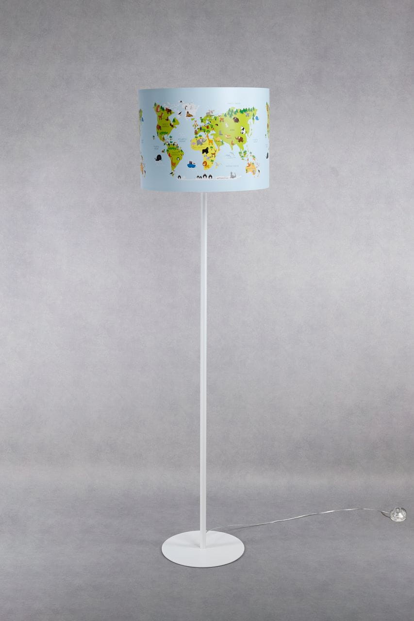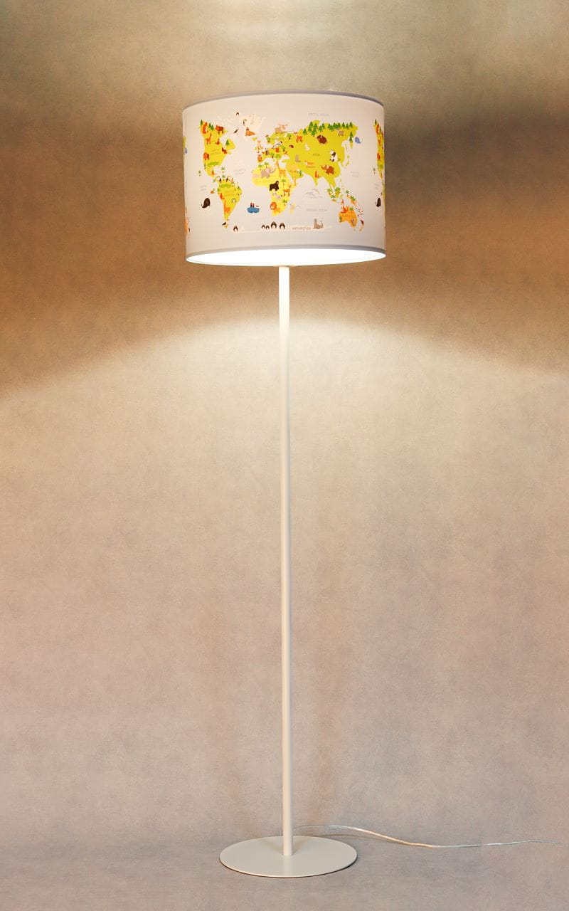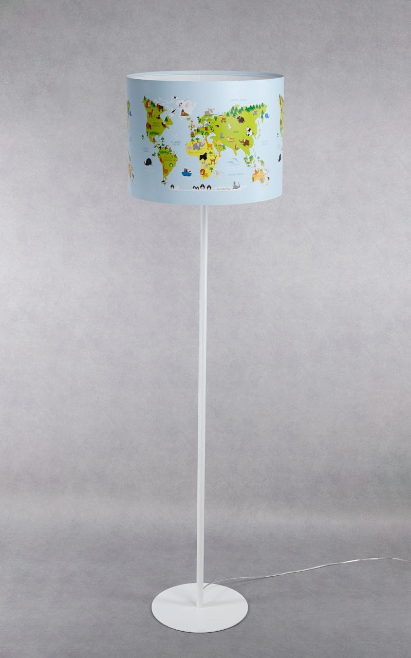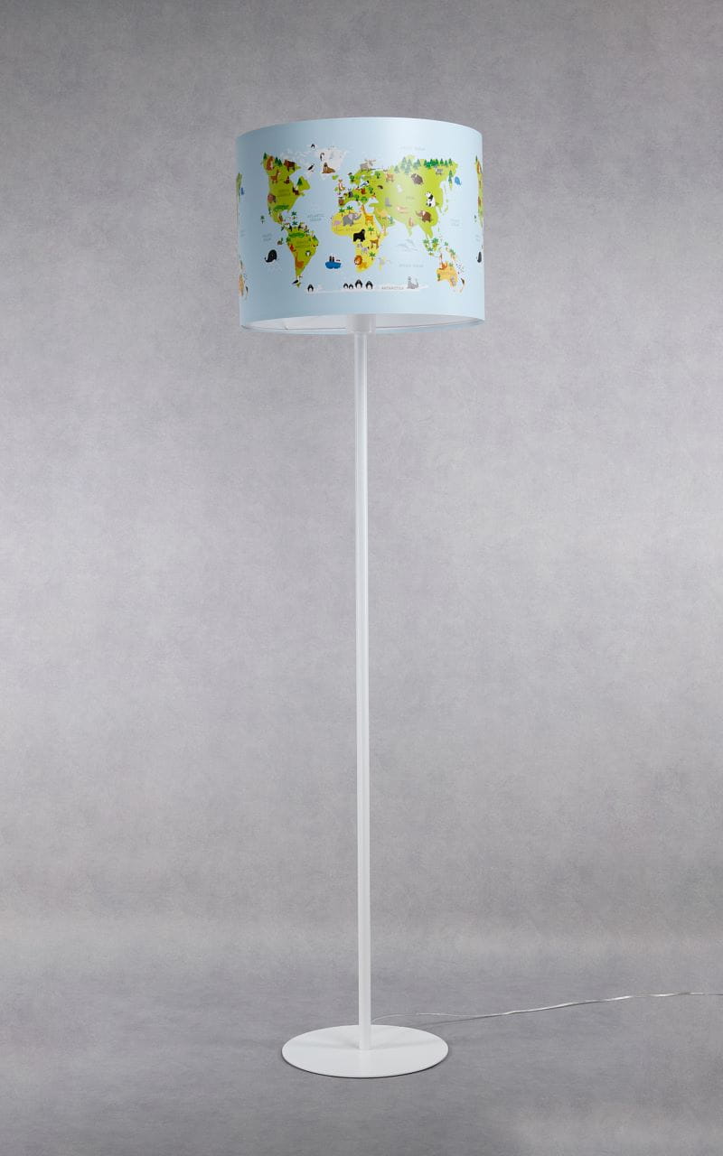 Lampa podłogowa do pokoju dziecka z nadrukiem lateksowym: mapa świata dla dziecka. Lampa, która nie tylko będzie dodatkowym źródłem światła w dziecięcym pokoju, ale także pomocą naukową w poznawaniu kontynentów i oceanów. Uniwersalny kształt i kolorystyka lampy pozwoli ustawić ją w pokoju każdego małego podróżnika: chłopca i dziewczynki. Lampa podłogowa posiada nożny włącznik, który pozwala z łatwością ją zaświecić lub zgasić jednym naciśnięciem stopy.