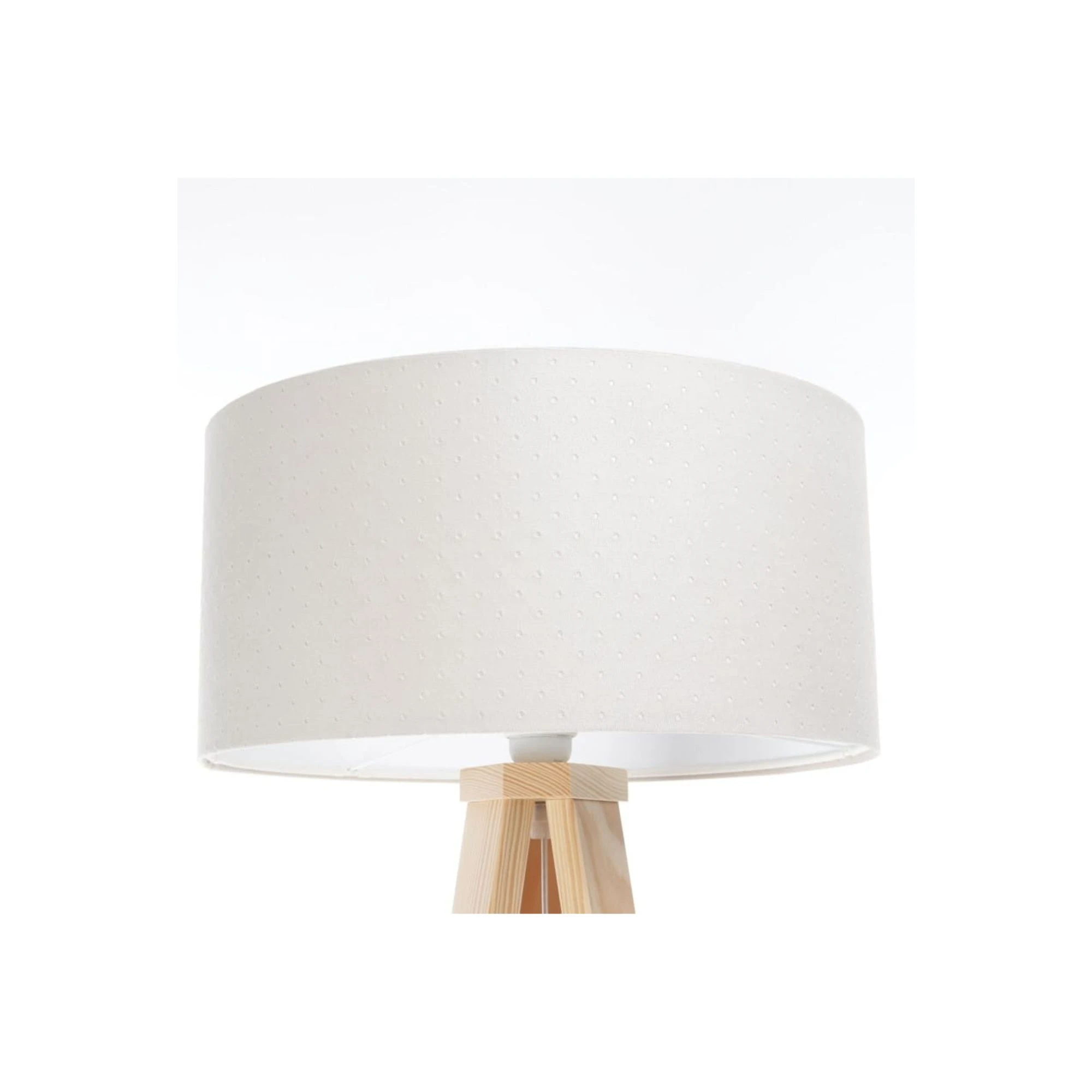 Abażur z pikowanej tkaniny jaśminowej miękko rozprasza światło, dzięki czemu lampa dobrze sprawdza się ustawiona przy łóżku, fotelu albo w kąciku odpoczynku. Drewniana podstawa w formie trójnogu dodaje całości lekkości i naturalnego charakteru, a możliwość wyboru wykończenia ułatwia dopasowanie lampy do aranżacji wnętrza. Ręczne wykonanie podkreśla staranność detali i spójność kolekcji Jasmine Bebe.