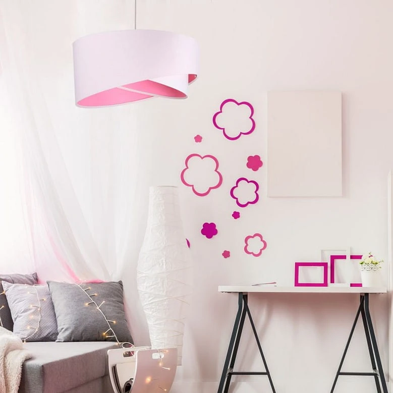 Asymetryczna wisząca lampa do pokoju dziewczynki. Delikatny różowy środek w połączeniu z białym welurem abażura tworzy piękną i spójną całość. Materiał odporny na działanie promieni UV, co pozwala zachować kolor lampy na długie lata.