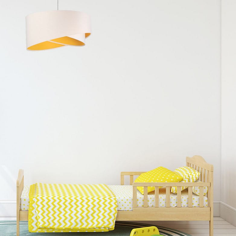 Asymetryczny biało-żółty abażur lampy wiszącej może być ozdobą nie tylko pokoju dziecięcego, ale również młodzieżowego. Abażur wykonany z weluru odpornego na działanie promieni UV, dzięki czemu jego kolor nie ulega blaknięciu.