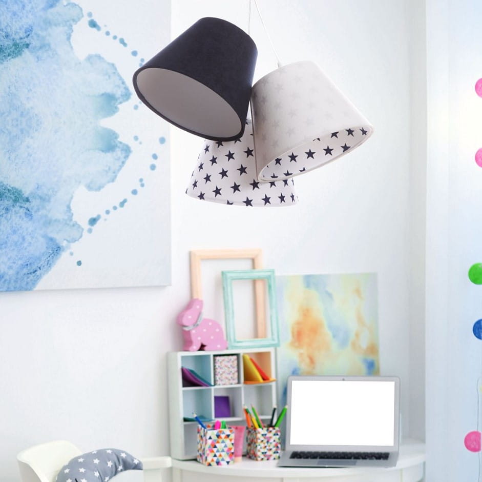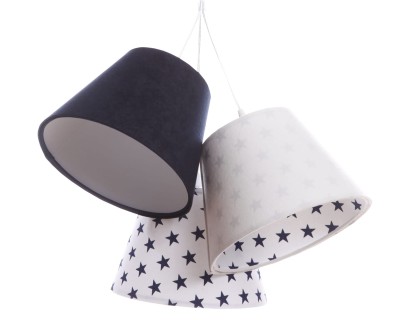 Lampa wisząca do pokoju dziecka, która nie tylko go rozświetli ale stanie się jego ozdobą. Trzy biało-czarne abażury przystrojono małymi gwiazdkami. Tkanina abażurów jest odporna na promienie UV, co chroni ją przed blaknięciem.